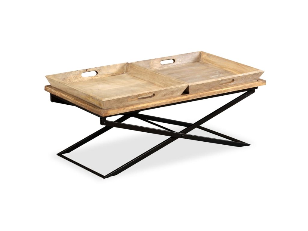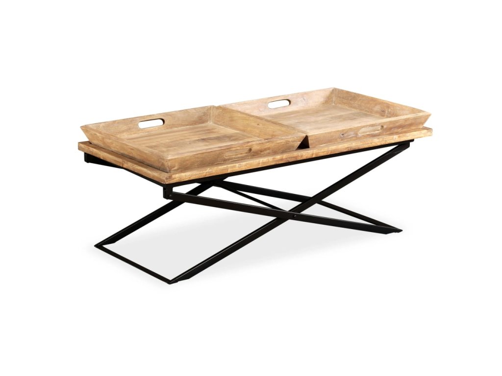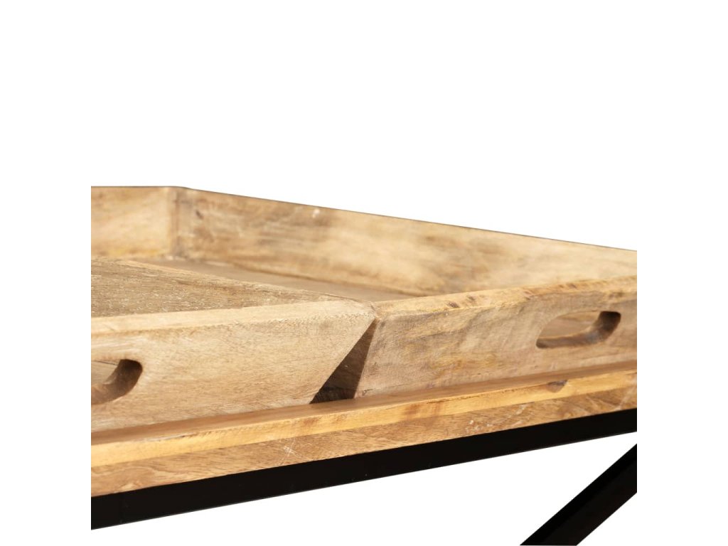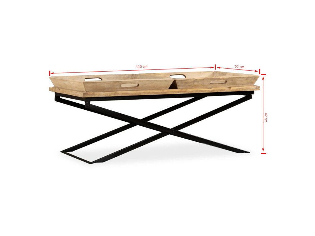 Deska stolu je vyrobena z masivního mangovníkového dřeva, které bylo obroušeno pro maximální odolnost. Nohy z oceli s práškovým nástřikem jsou navrženy do tvaru X, čímž je zajištěna perfektní stabilita stolku. Konferenční stolek disponuje dvěma dřevěnými podnosy, jež se výborně hodí k odkládání nápojů či jídla nebo k vystavování dekorativních předmětů jako jsou košíky s ovocem a vázy. V případě potřeby se dají snadno sejmout, takže je můžete používat i odděleně. Montáž je snadná.