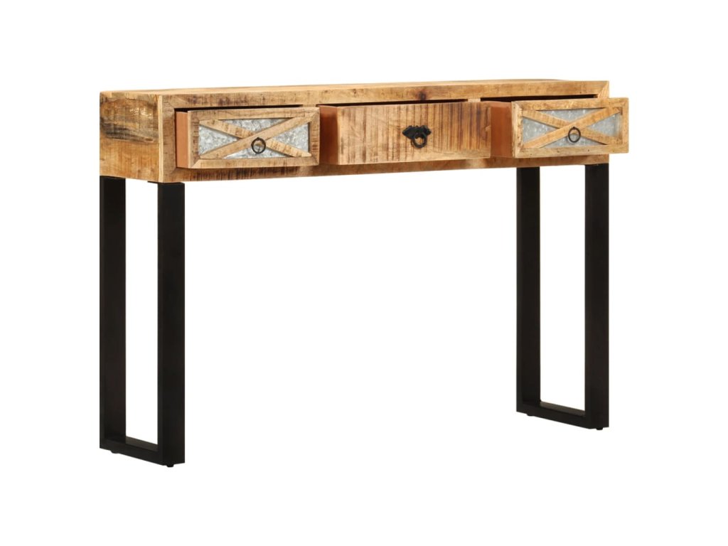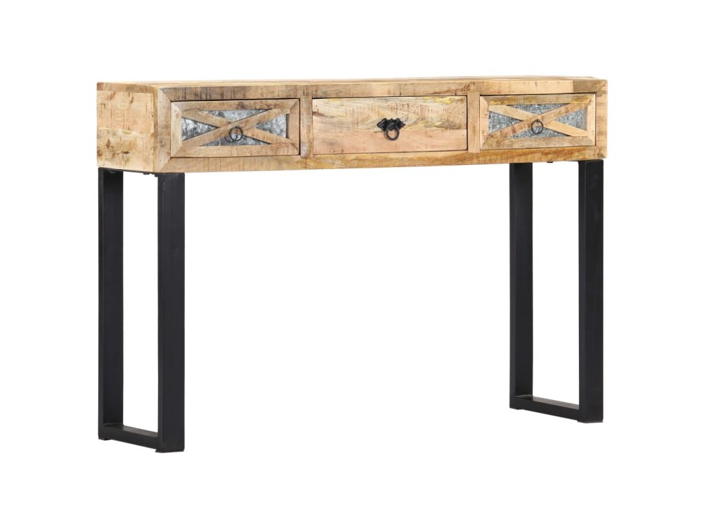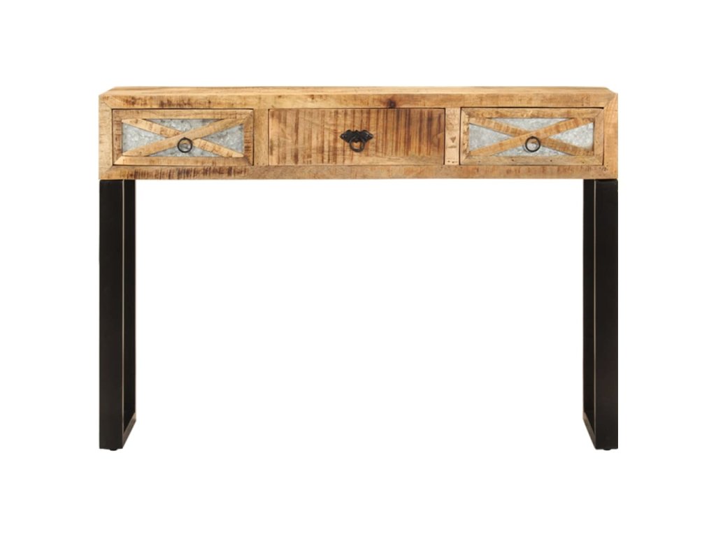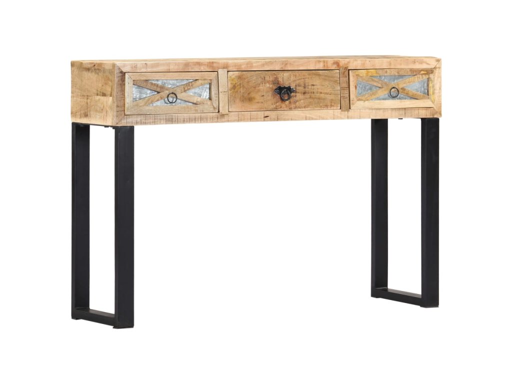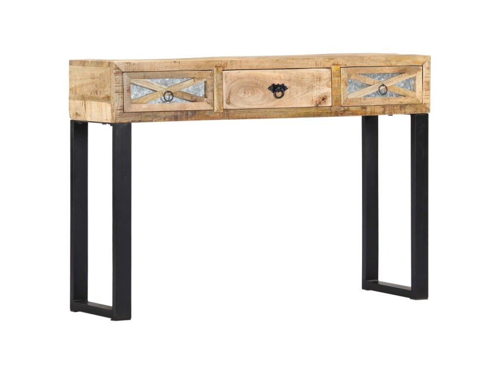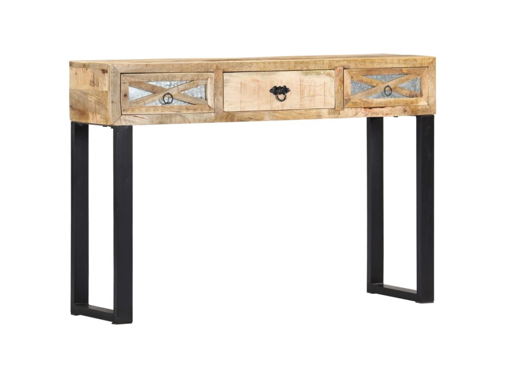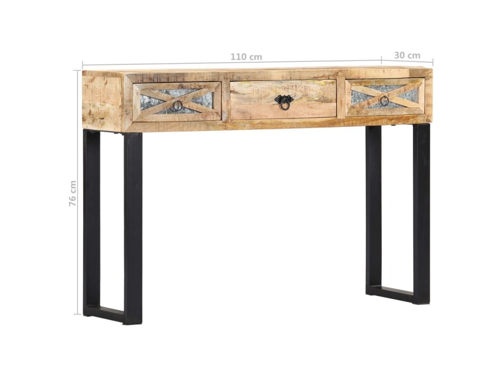 Stolek je zhotoven z masivního hrubého mangovníkového dřeva a má pevnou desku, na které si můžete vystavit dekorativní předměty, jako jsou mísy s ovocem či vázy. Pevné nohy z pozinkované oceli zaručují stabilitu a odolnost, takže vám stolek vydrží sloužit po dlouhá léta. Mangovník má husté a robustní tvrdé dřevo s překrásnými hnědými či zlatými pruhy a liniemi na povrchu. Každá fáze výrobního procesu se provádí s mimořádnou péčí, ať už se jedná o leštění, natírání anebo lakování. Spoustu úložného prostoru najdete ve 3 zásuvkách, do kterých si můžete přehledně uspořádat nejrůznější menší věci tak, abyste je měli vždy po ruce.