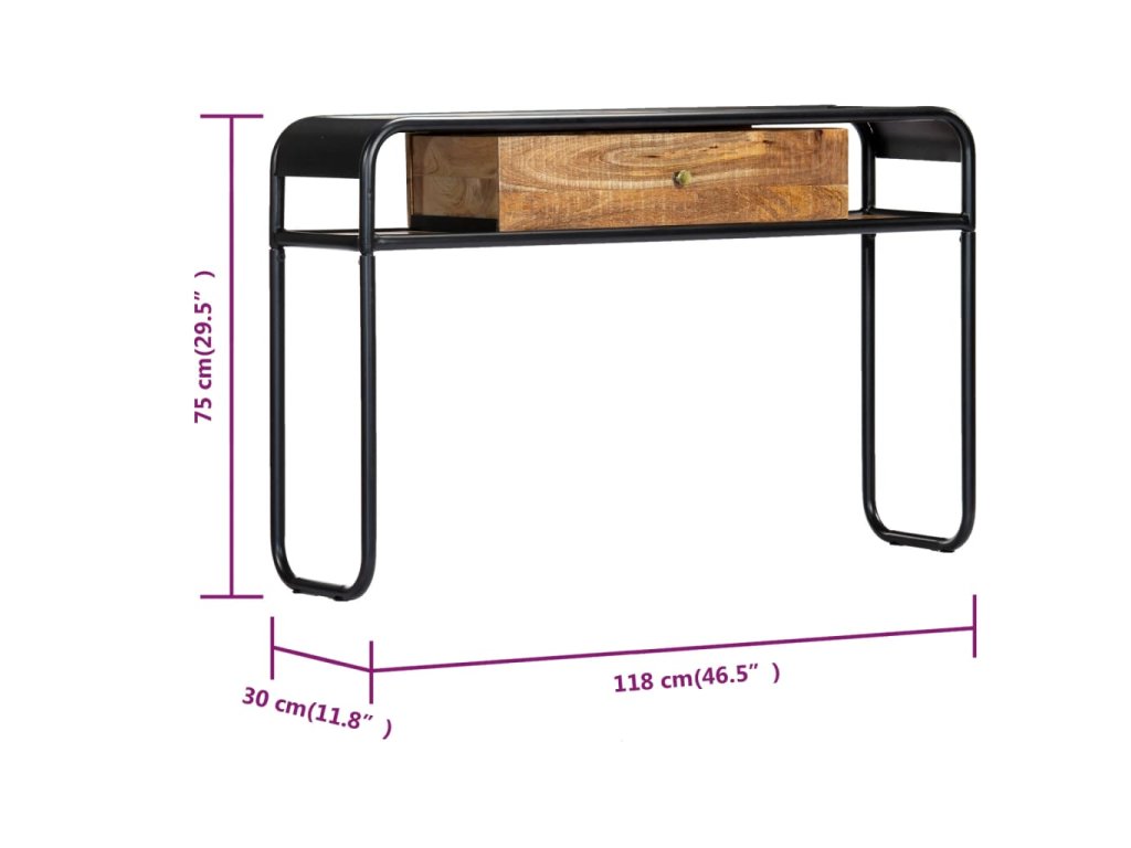 Stůl je vyroben z masivního mangovníkového dřeva, a proto je mimořádně stabilní a odolný. Mangovník je husté a robustní tvrdé dřevo, které se pyšní krásnou hnědou nebo zlatou kresbou. Rám z oceli s práškovým nástřikem dodává stolu dodatečnou stabilitu. Každý krok výrobního procesu je prováděn s tou největší pečlivostí, ať už se jedná o leštění, natírání či lakování. Konzolový stolek disponuje 1 šuplíkem a 2 přihrádkami, ve kterých najdete dostatečný úložný prostor pro multimediální přístroje, knihy a různé ostatní předměty. Stolek je již sestaven; žádná montáž není nutná.