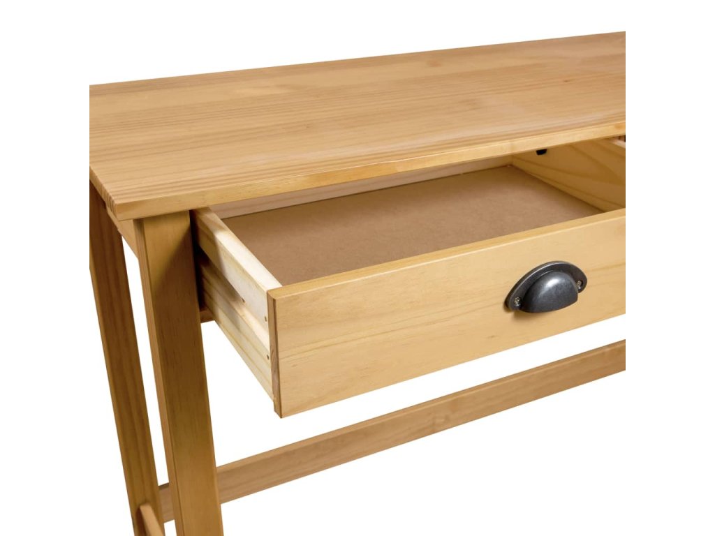 Dřevěný stolek se vyznačuje vynikajícím řemeslným zpracováním v kombinaci se skvělou funkčností. Vzhledem ke svému kompaktnímu designu zabírá náš konzolový stolek velmi málo místa a skvěle zapadne do menších prostor. Dvě zásuvky s hladkým otevíráním nabízejí další úložný prostor pro vaše ozdoby, kosmetiku a další soukromé věci. Tento toaletní stolek je vyrobený z masivního borového dřeva, takže vám vydrží sloužit celou řadu let.