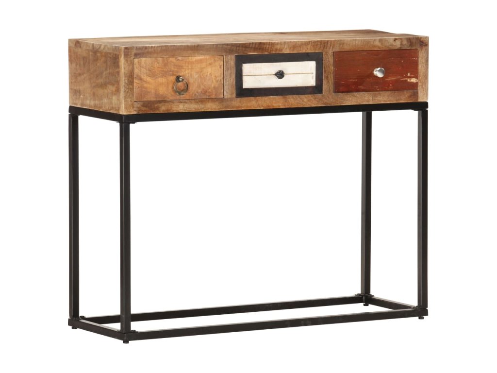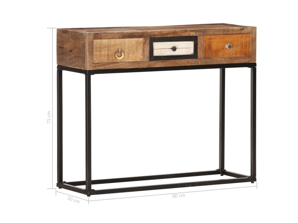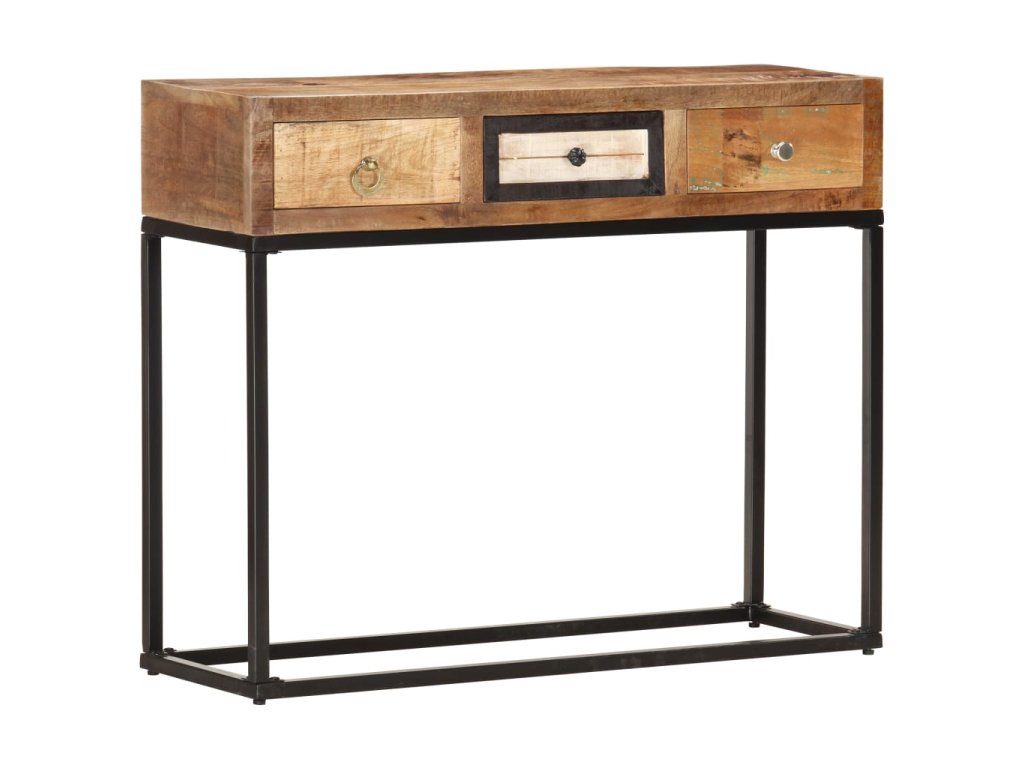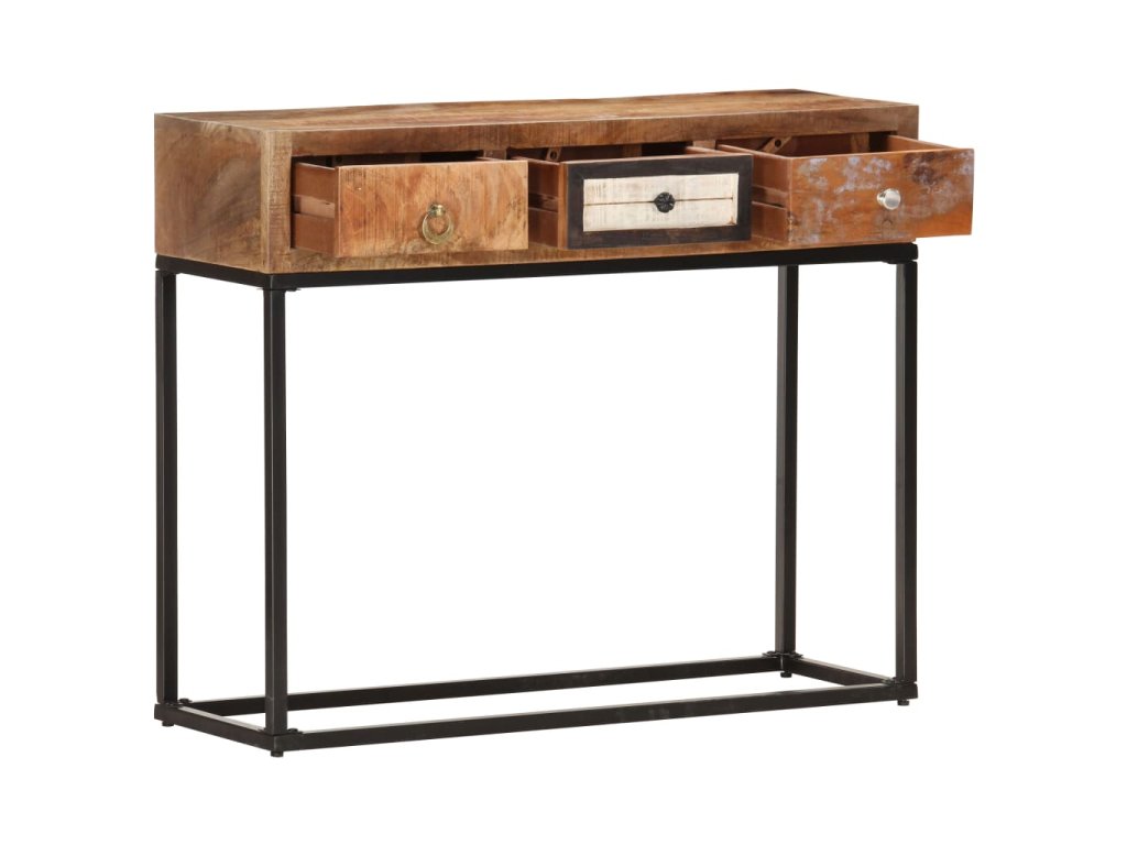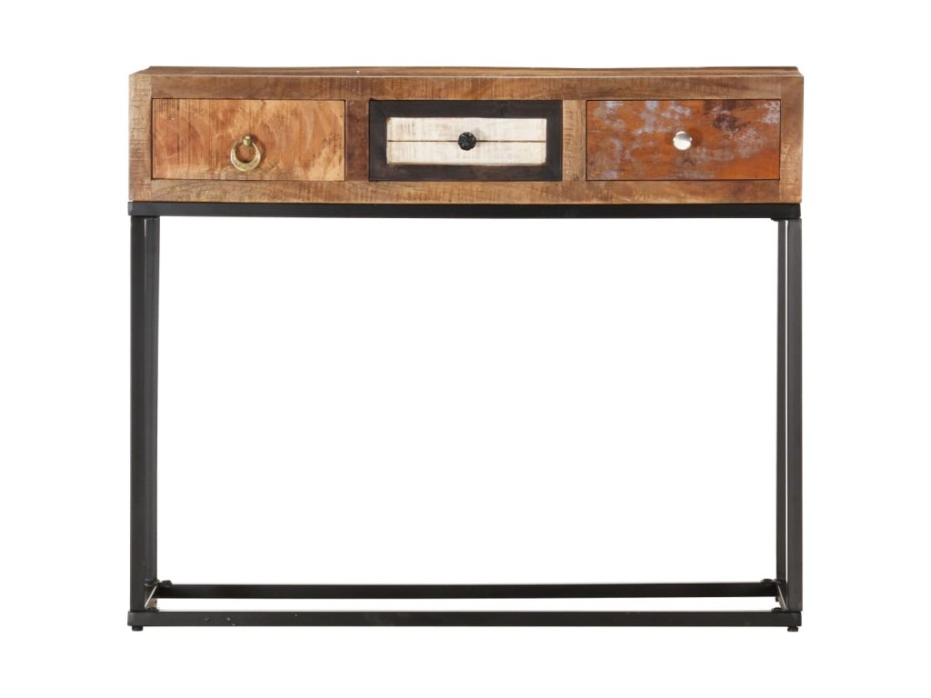 Stolek je vyrobený z masivního recyklovaného dřeva, které pochází z trámů, podlah a podpěrných nosníků ze starých budov určených k demolici. Sestává tedy z různých druhů dřeva, jako jsou borovice, teak, buk, dub, cedr, mangovník, akácie apod. Recyklované dřevo tak nabývá vlastností všech těchto rozličných typů dřevin. Navíc je již zestárlé, zvětralé a vyschlé, takže se nesmršťuje ani neohýbá. Překrásná kresba dřeva dává každému kusu příborníku jedinečný charakter, kterým se lehce liší od všech ostatních. Práškově lakovaný rám přidává stolku industriální nádech. Stolek má 3 zásuvky, nabízí tedy spoustu prostoru, kam si můžete přehledně uložit celou řadu nejrůznějších věcí. Sestavení konzolového stolku je snadné.