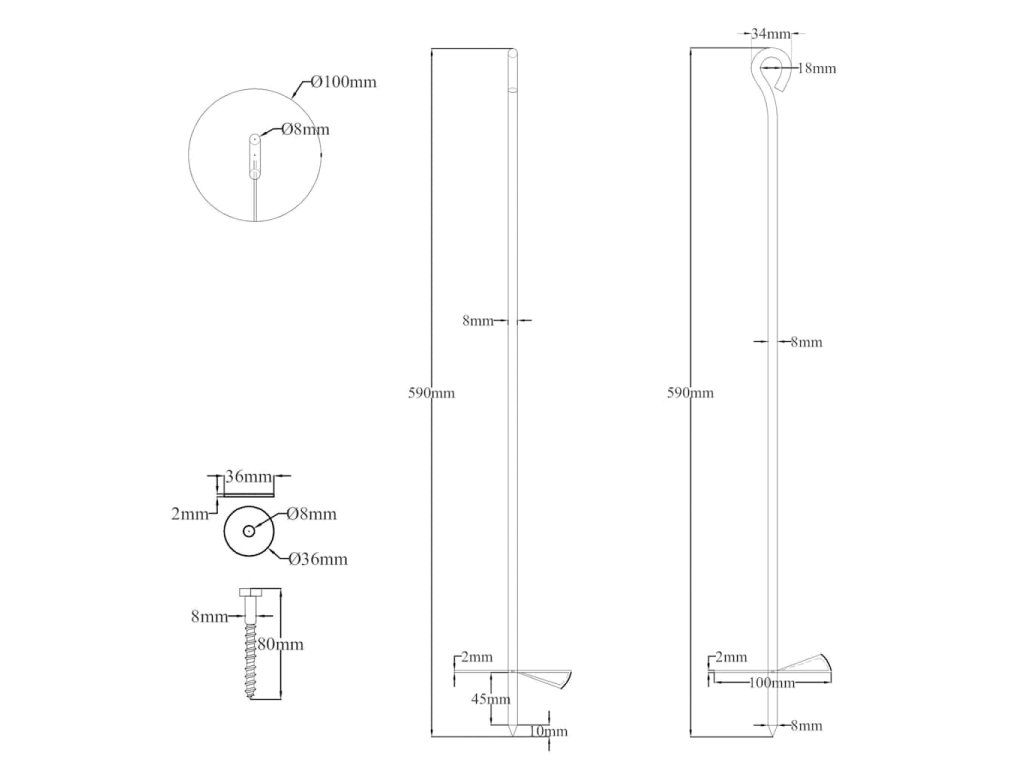 Kotvící kolík je vyrobený z pozinkovaného kovu, a proto je odolný vůči povětrnostním vlivům a hnilobě. Je zakončený očkem a dole má jednu nebo dvě spirály. Instalace zemní kotvy je velmi snadná. Pouze jedna osoba s vhodnou kovovou tyčí je snadno zašroubuje do půdního podkladu.