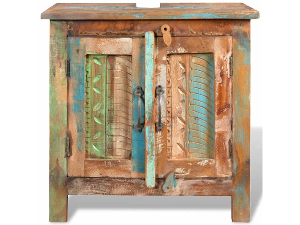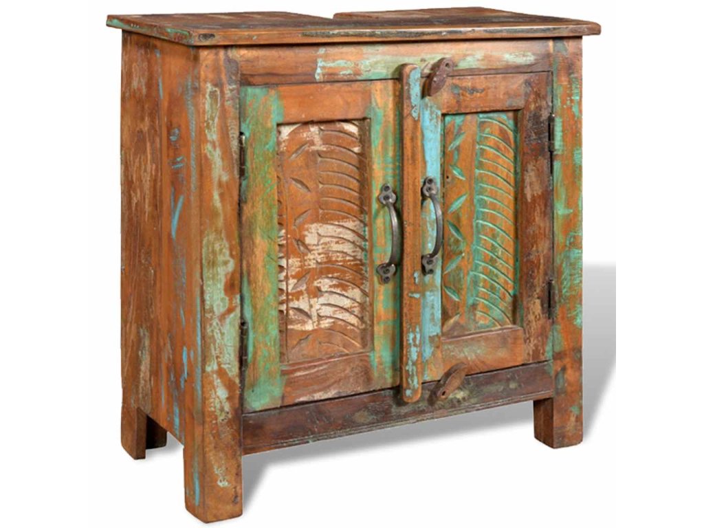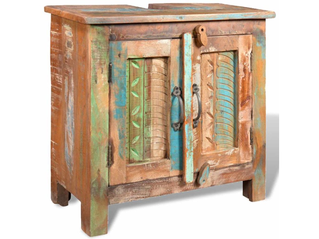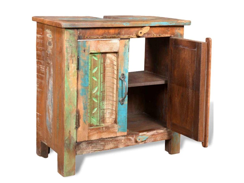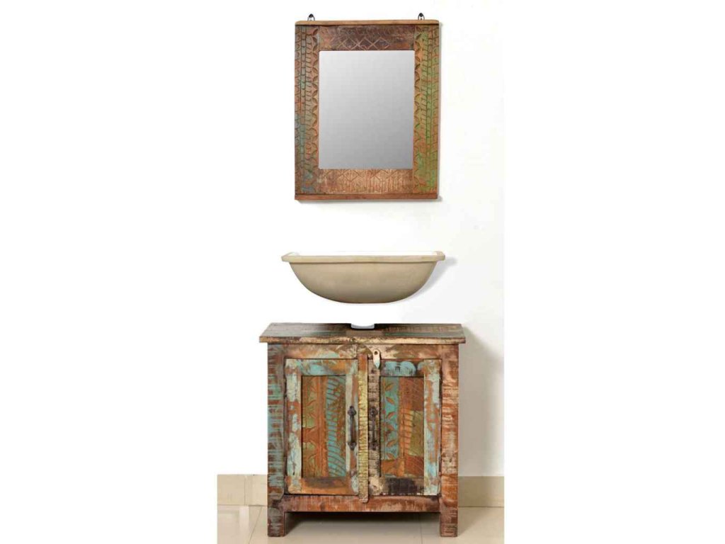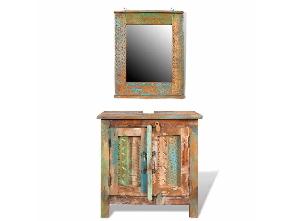 Jak skříňka, tak rám zrcadla jsou vyrobeny z použitého dřeva, což znamená, že každý kus nábytku je jedinečný a trochu jiný. Nábytek vyrobený z použitého dřeva má vlastnosti různého dřeva jako je týkové dřevo, akácie, dřevo z mangovníku, atd. Znovu použité dřevo je masivní, odolné a pevné a co víc, je krásné. Otvory po hřebících a různá struktura dřeva dává historii těmto kusům nábytku a umožňuje nové generaci, aby zde zachytili i svojí historii. Pokud budete mít tuto soupravu nábytku doma, dáte tím najevo svůj souhlas s obnovením zdrojů, s ochranou životního prostředí a s udržitelným rozvojem.
