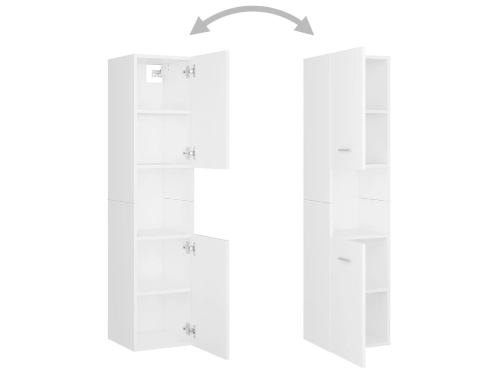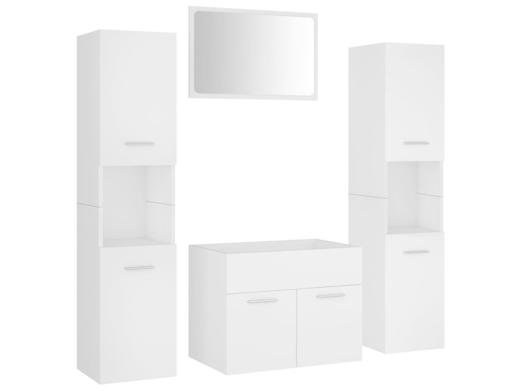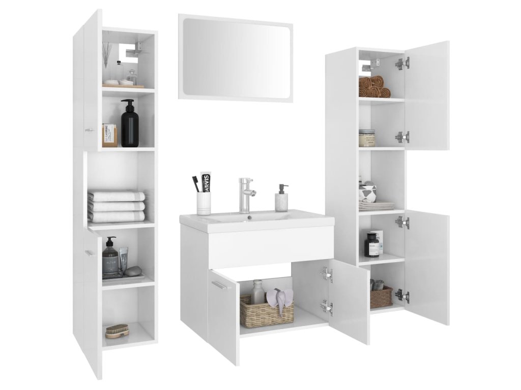 Sada nábytku obsahuje skříňku pod umyvadlo, 2 vysoké skříně a zrcadlo. Stylová umyvadlová skříňka má 1 přihrádku a nahoře je ideálně uzpůsobená k umístění umyvadla. V každé z vysokých skříní najdete za dvěma dvířky celkem 5 přihrádek, které vám poskytnou spoustu místa k uložení vašich věcí. Zrcadlo zase dodá vaší domácnosti nový půvab. Celý set koupelnového nábytku snadno očistíte navlhčeným hadříkem.