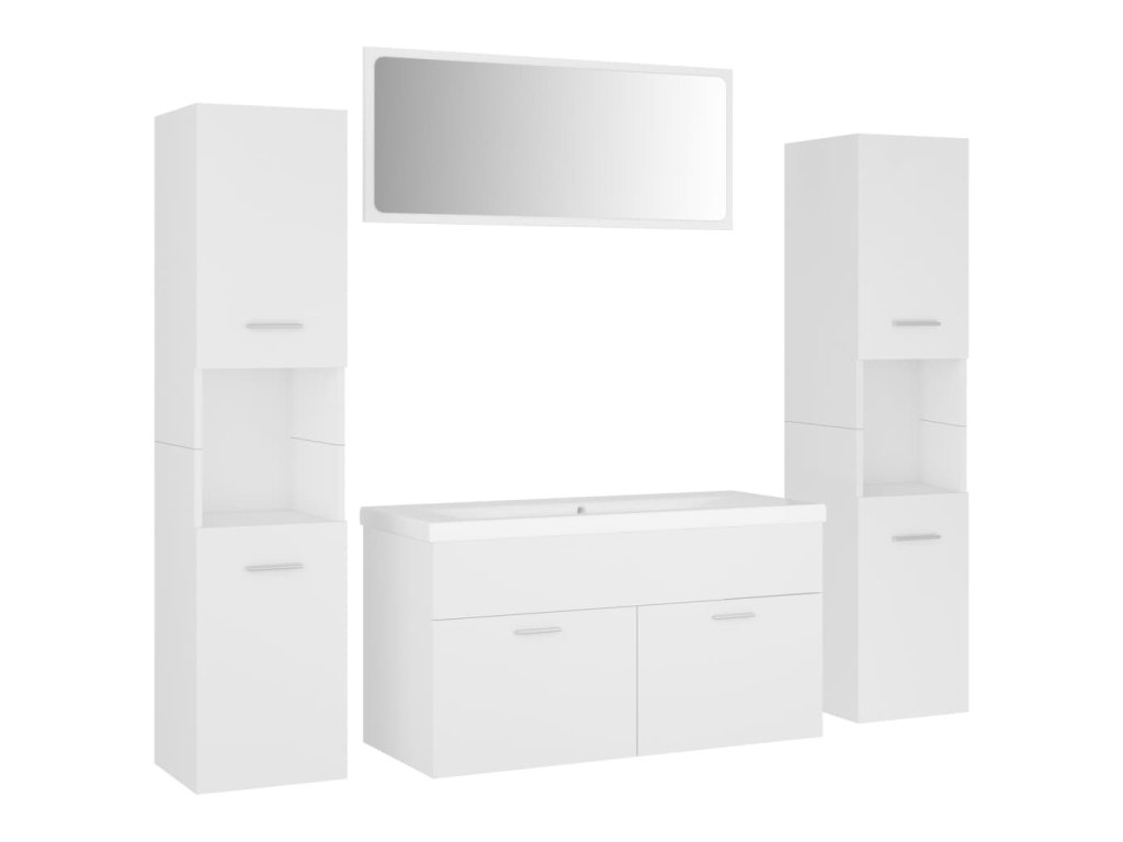 Sada nábytku obsahuje umyvadlovou skříňku s umyvadlem, 2 vysoké skříňky a zrcadlo. Stylová skříňka pod umyvadlo má 1 přihrádku, dokonale se hodí pod vaše umyvadlo a nabídne vám šikovné úložné řešení do koupelny. Keramické umyvadlo neslouží pouze jako hygienická nádoba pro každodenní použití – hraje také významnou dekorativní roli. Svým trendovým a moderním designem navíc krásně doplní každý styl zařízení. Umyvadlo je vybavené přepadem, který umožňuje odtékání vody v případě, že se umyvadlo příliš přeplní. V každé z vysokých skříněk s dvěma dvířky se nachází celkem 5 přihrádek, poskytnou vám tedy spoustu místa k uložení vašich věcí. Zrcadlo zase přidá vaší domácnosti na půvabu. Celý set koupelnového nábytku lze snadno očistit navlhčeným hadříkem.