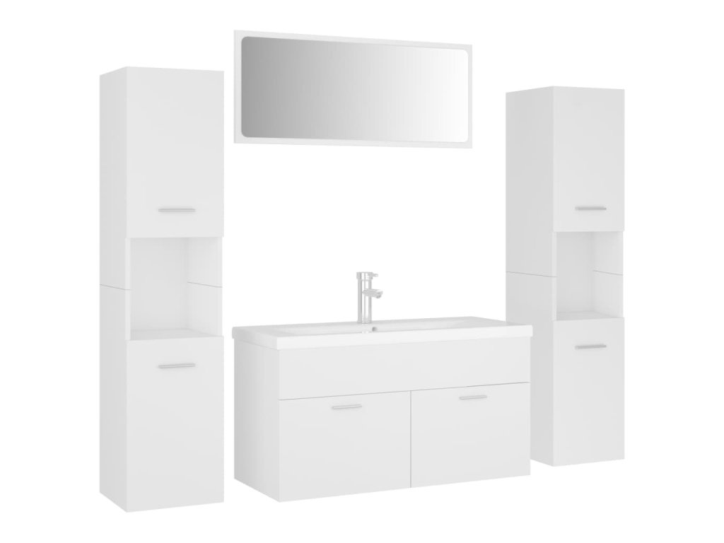 Set nábytku obsahuje skříňku pod umyvadlo, 2 vysoké skříně, zápustné umyvadlo a zrcadlo. Stylová skříňka pod umyvadlo má 1 přihrádku a shora je ideálně uzpůsobená k umístění umyvadla. V každé z vysokých skříní s dvěma dvířky najdete celkem 5 přihrádek a 2 dvířky, které vám poskytnou spoustu místa k uklizení vašich koupelnových potřeb. Keramické umyvadlo neslouží jen jako praktická nádoba pro každodenní použití – hraje také významnou dekorativní roli. Vzhledem k jeho trendovému a modernímu designu zaručeně zapadne do každého stylu zařízení. Je vybavené také přepadem, který umožňuje odtok vody, pokud se umyvadlo příliš přeplní. Zrcadlo vám rovněž pomůže zkrášlit vaše bydlení. Celou soupravu nábytku lze navíc snadno čistit navlhčeným hadříkem.