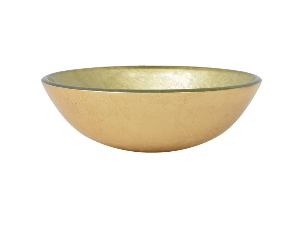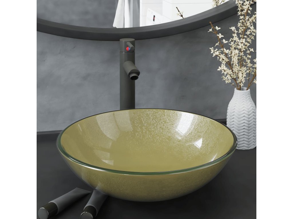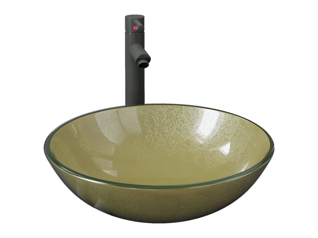 Koupelnové umyvadlo s baterií a výpustí zlaté tvrzené sklo 3098462