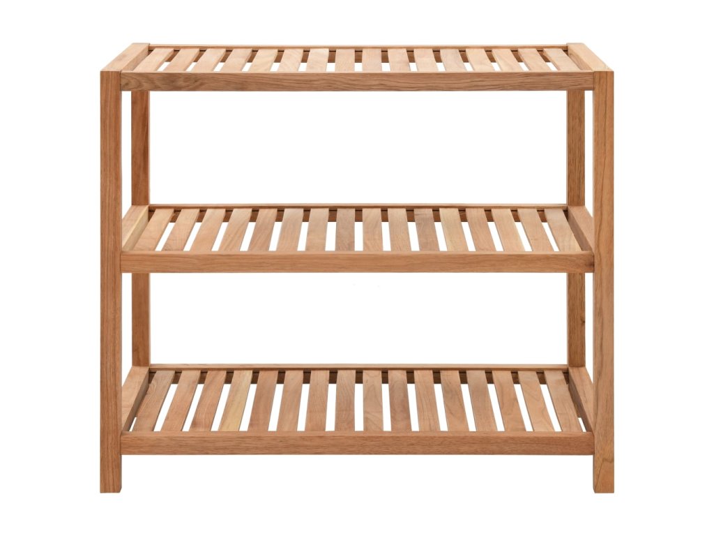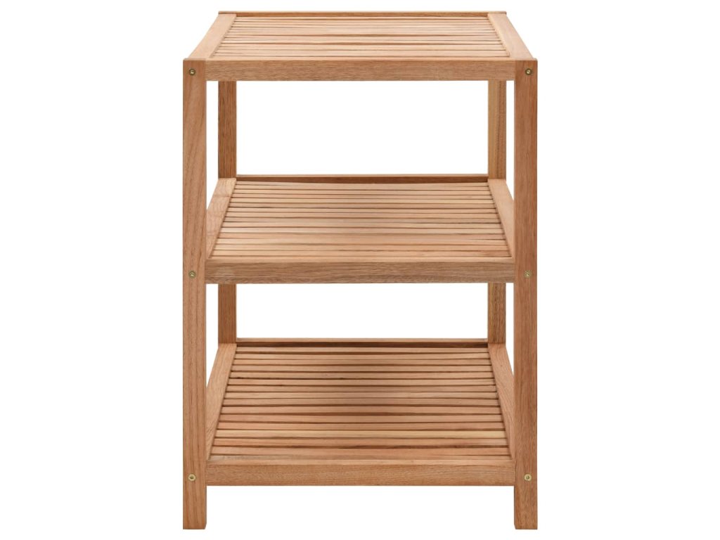 Koupelnový regál má tři police, které poskytují dostatek úložného prostoru pro ručníky a hygienické potřeby. Laťková konstrukce umožňuje dobré větrání věcí na policích. Regál je vyrobený z masivního ořechového dřeva, takže je velmi robustní a odolný.