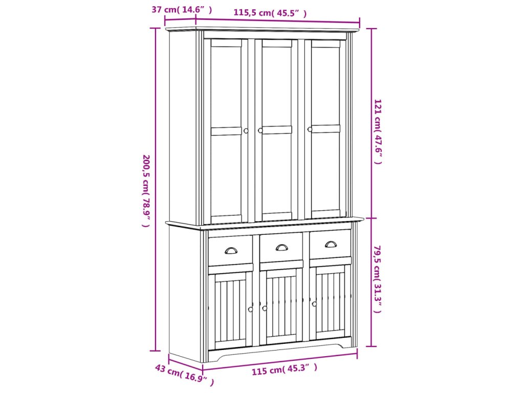 - Rozměry horní části kredence: 115,5 x 37 x 121 cm (D x Š x V)