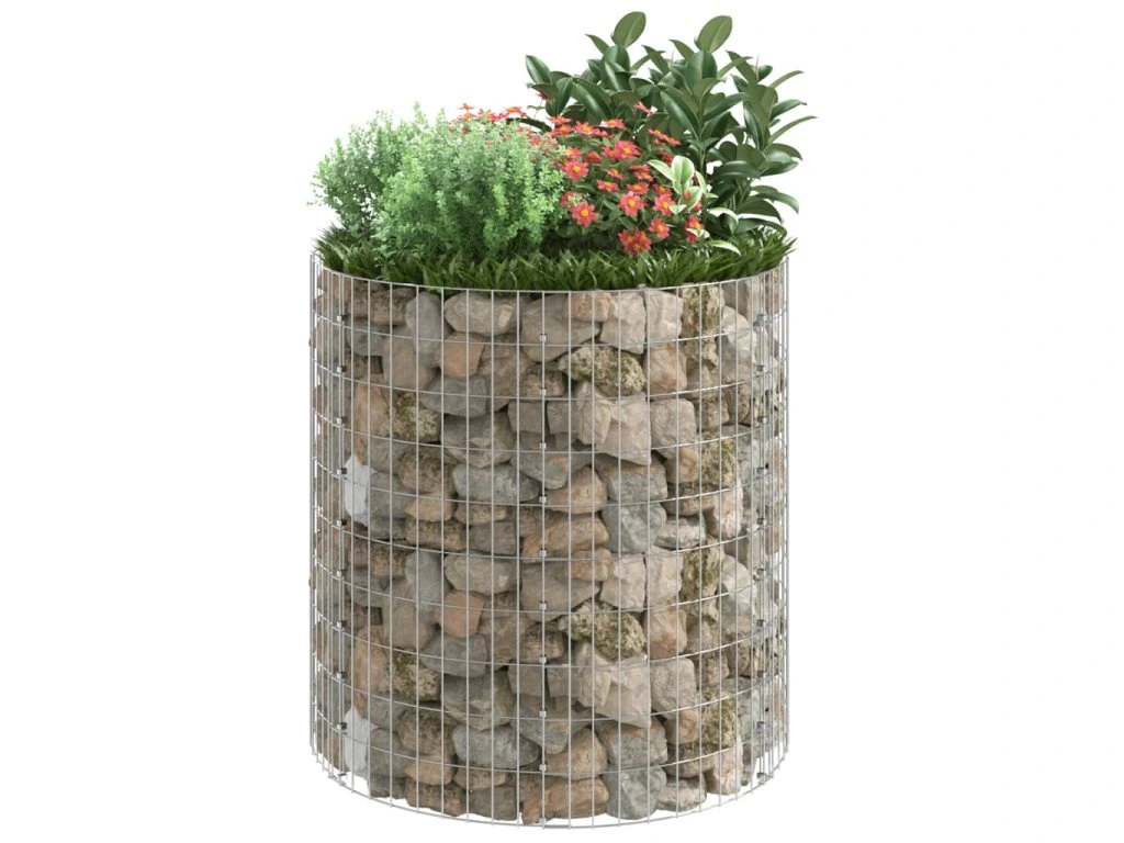 Tento kruhový gabionový sloupek představuje praktický způsob, jak vytvořit pevný okraj pro rostliny na vaší zahradě a terase.