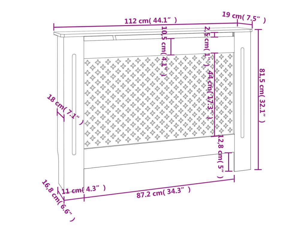 Tento kryt na radiátor představuje jak stylový, tak praktický doplněk do vašeho obývacího pokoje. Je navržen tak, aby dodal vašemu topení dekorativní charakter a zároveň vám poskytl více prostoru pro vaše zarámované fotografie, knihy, ozdoby apod.