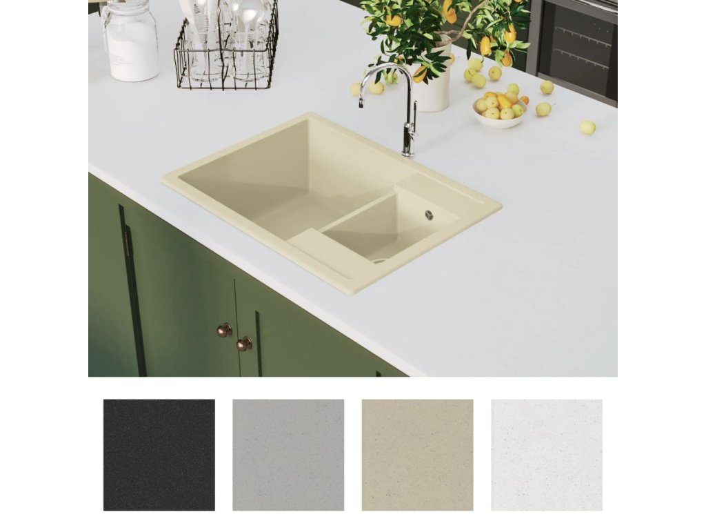 Náš žulový kuchyňský dřez je skvělým nadčasovým doplňkem do vaší kuchyně. Má elegantní design a tvoří ho jeden extra hluboký dřez a jeden malý dřez.
