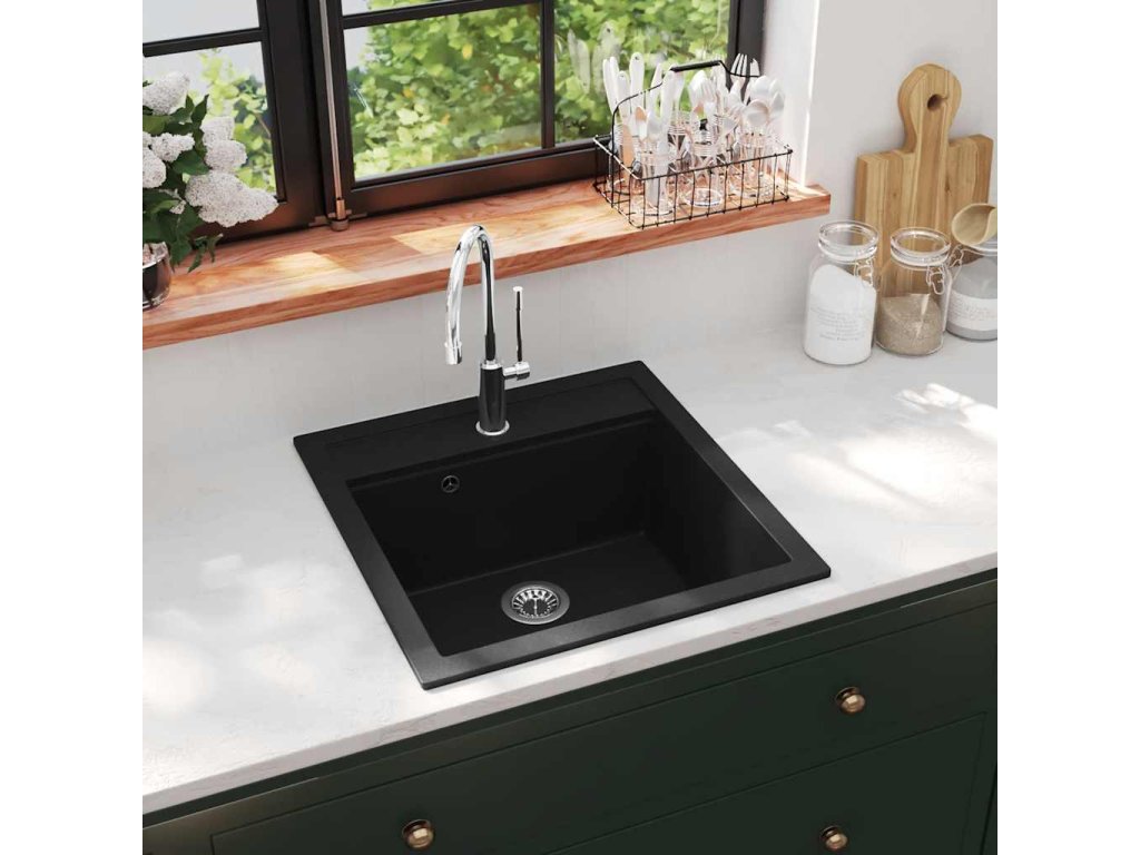 Použitá vysoce kvalitní žula činí dřez tepelně odolný, výborně vzdoruje poškrábání a nárazům a snadno se čistí. Částečně převrtaný otvor můžete snadno prorazit malým kladívkem nebo kulatým trubkovým nářadím a baterii nainstalovat. Mezitím můžete také otvor ponechat neporušený, čímž zůstane váš dřez kompletní, pokud již máte baterii na pracovní desce. Součástí je také sítko pro snadné odstranění nečistot.