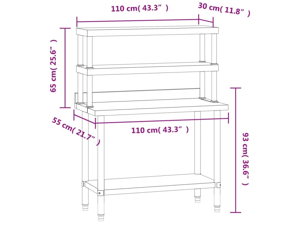 - Dostatek pracovního prostoru: Nerezový přípravný stůl je navržen se spodní a 2patrovou horní policí, které lze přizpůsobit různým úložným potřebám, a poskytuje dostatek úložného místa pro vaši mikrovlnou troubu, kuchyňské náčiní nebo jiné nástroje, které můžete potřebovat.