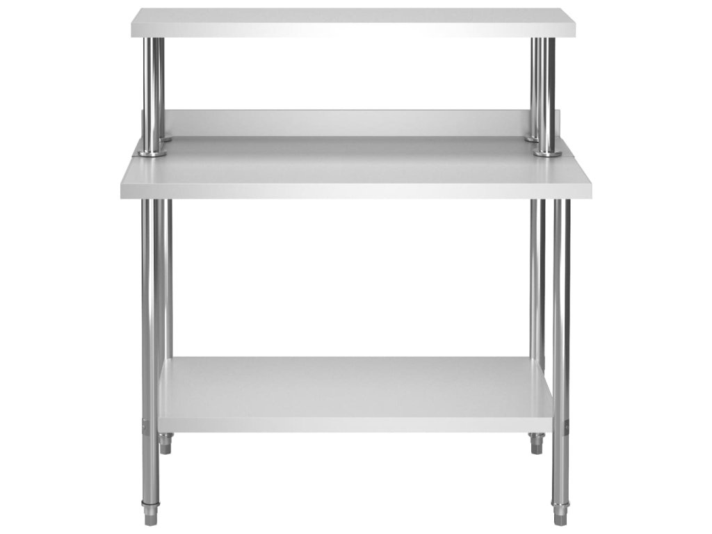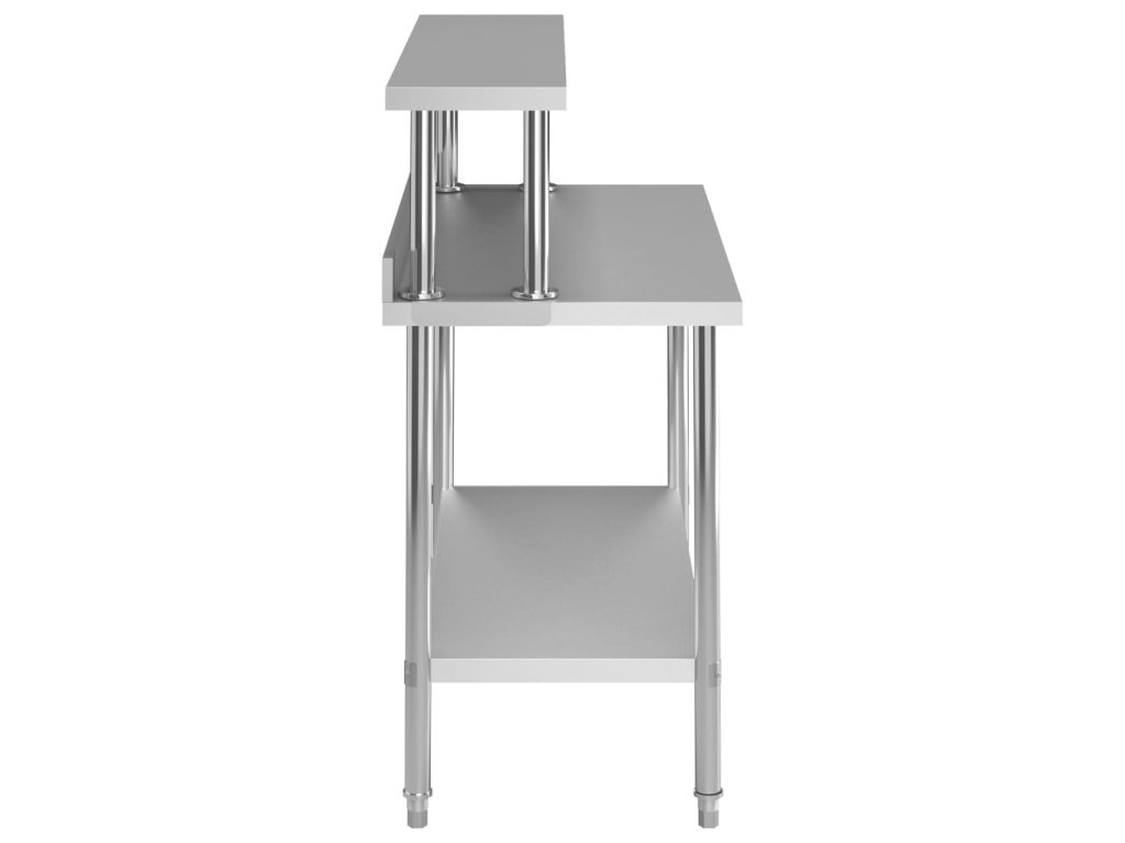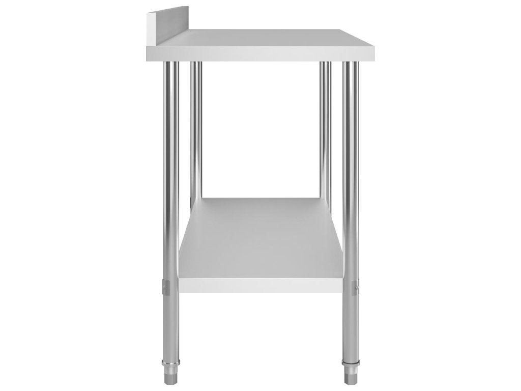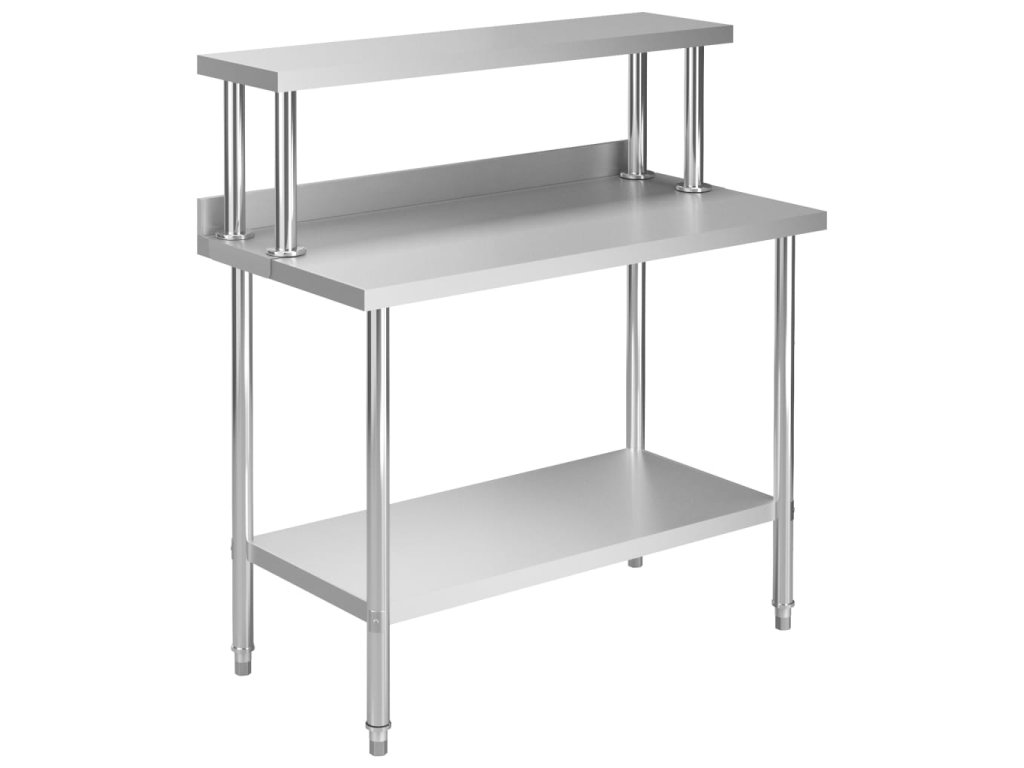 Gastronomický pracovní stůl je vyrobený z nerezové oceli vysoké kvality, a tak vydrží i každodenní náročné používání. Snadno se také čistí. Navíc je vybavený praktickou zadní obrubou, která zpříjemňuje jeho použití. Ve spodní části se nachází police, kde si můžete zorganizovat váš úložný prostor. Nohy s funkcí vyrovnávání mají neklouzavý design, který zaručuje skvělou stabilitu a zároveň chrání podlahu. Horní police vám umožní využít plochu stolu na maximum.