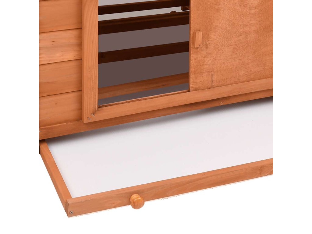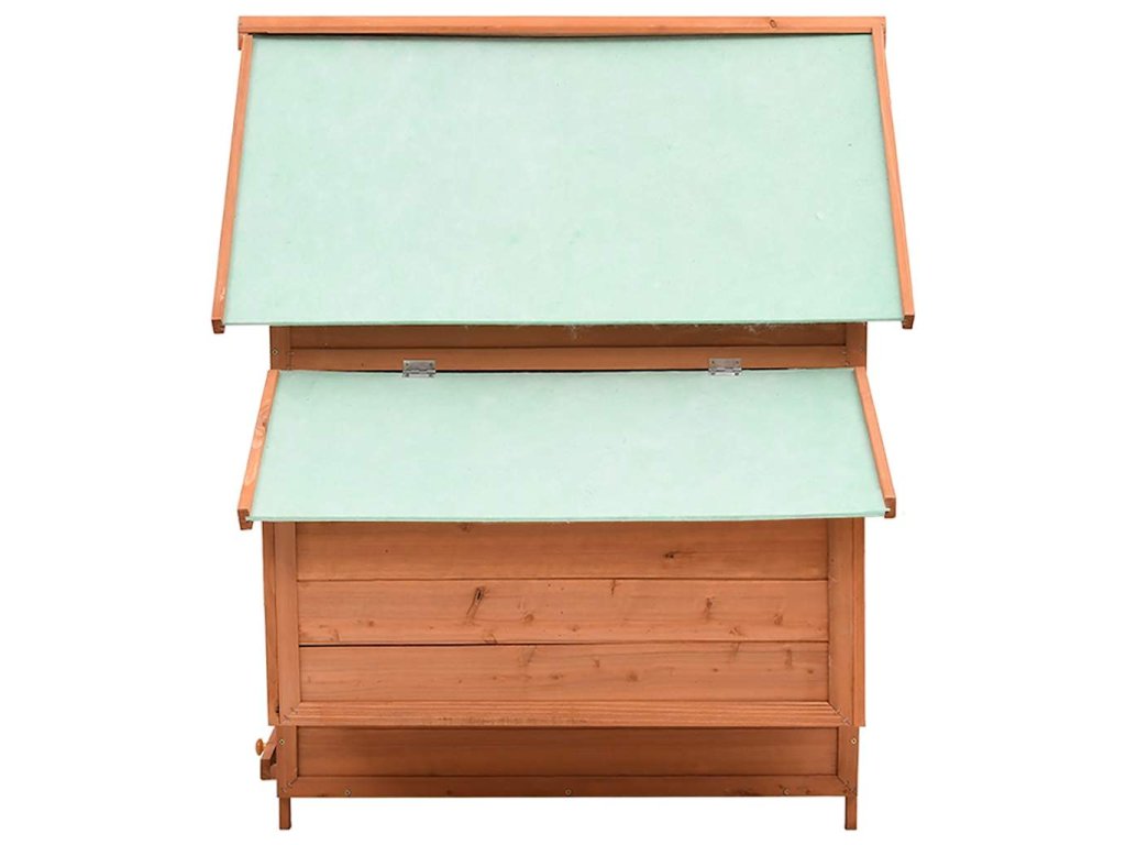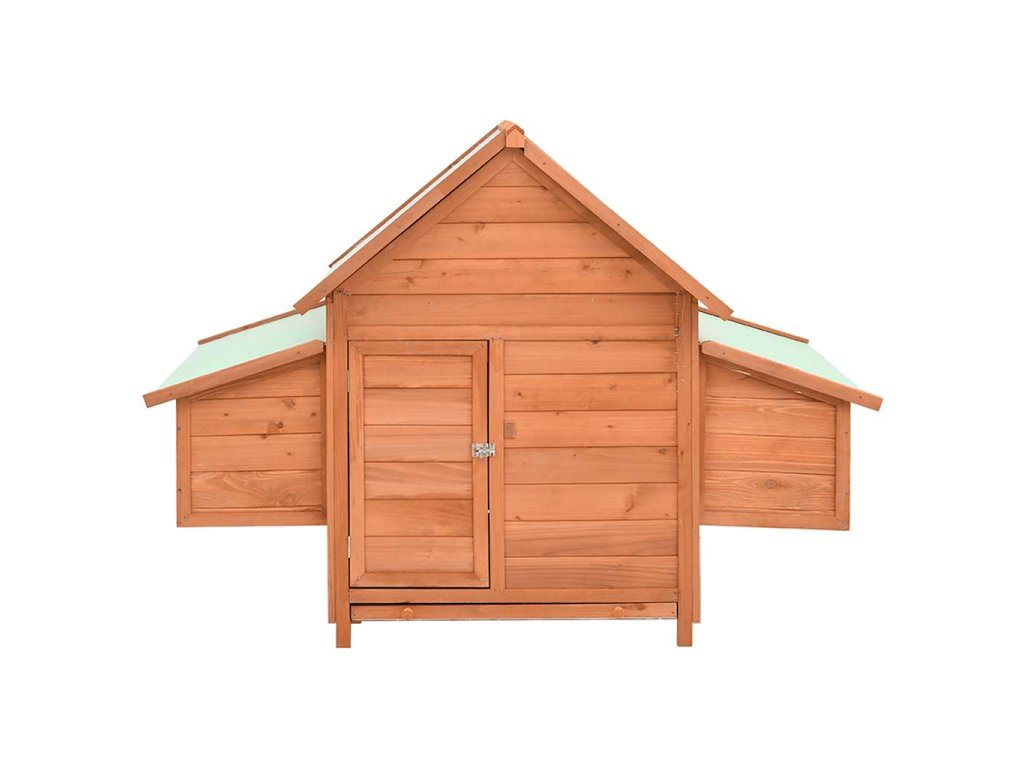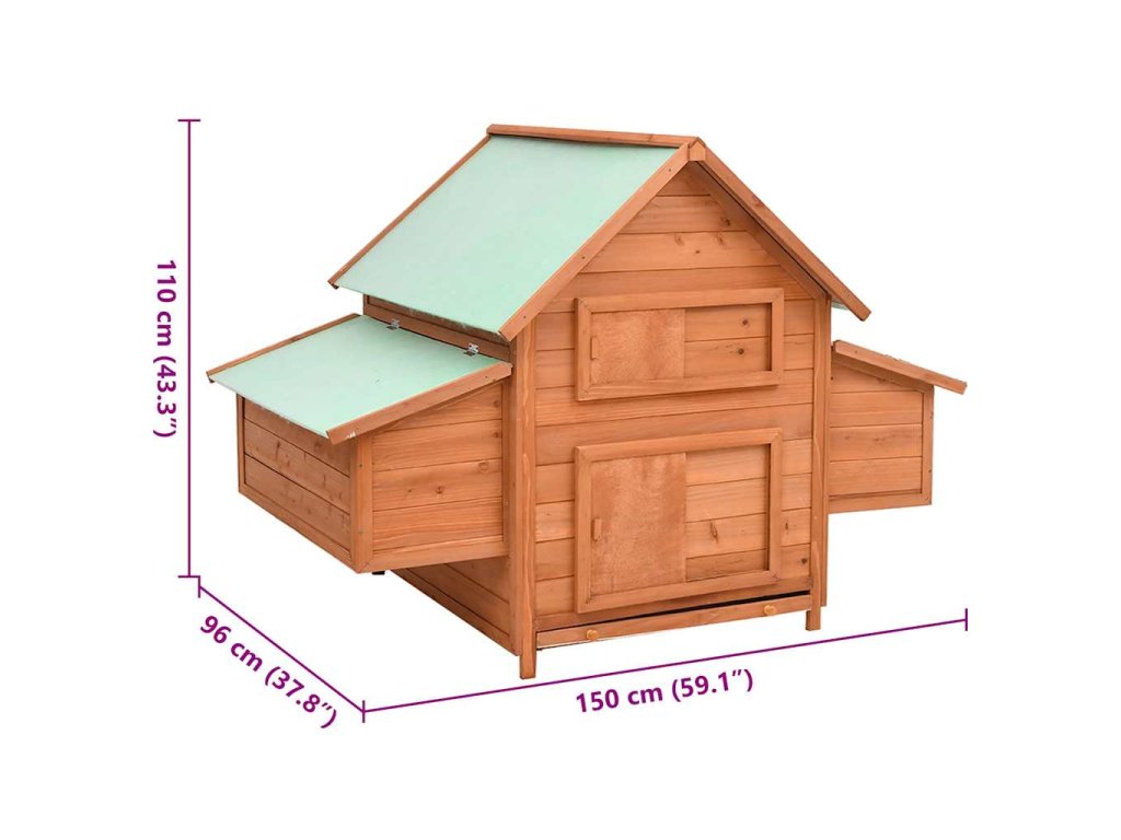 Kurník je vyrobený z masivního jedlového dřeva, takže je pevný a odolný. Nepromokavá tkanina na střechách udržuje slepice v suchu a vytváří pro ně teplé a pohodlné prostředí k odpočinku.