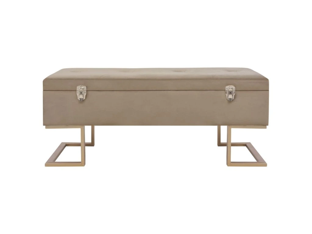 Sametové čalounění v béžové barvě je měkké na dotek a velmi pohodlné a svou barvou oživí každý interiér. Disponuje vestavěným úložným prostorem, který poskytuje dodatečné místo pro uschování nejrůznějších věcí. Nohy ze železa s práškovým nástřikem a zlatým nátěrem lavičce dodávají na stabilitě a životnosti. Naše lavice vnese do vašeho interiéru autentické kouzlo a stane se nedílnou součástí vašeho pokoje.