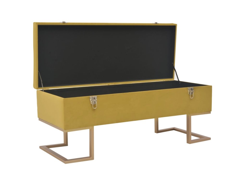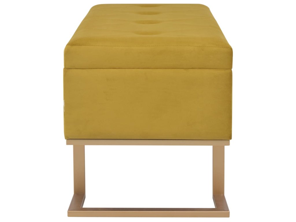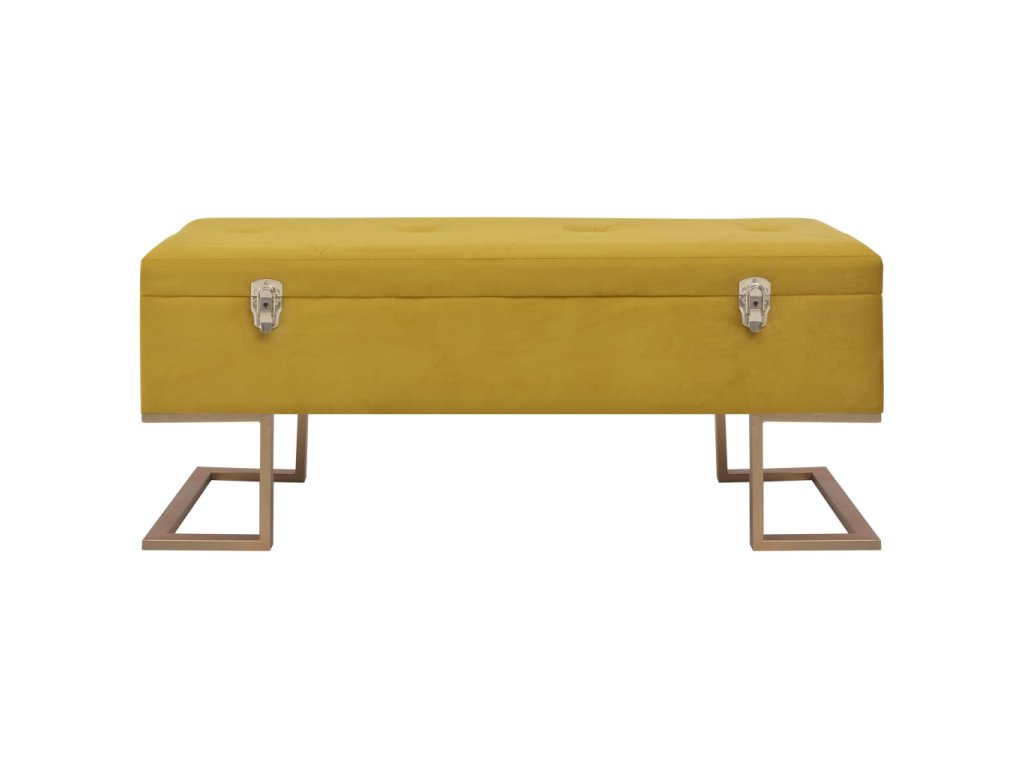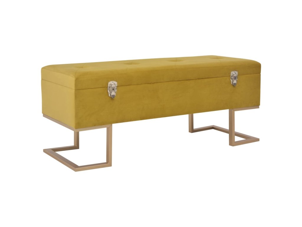 Sametové čalounění v hořčicové barvě je měkké na dotek a velmi pohodlné a svou barvou oživí každý interiér. Disponuje vestavěným úložným prostorem, který poskytuje dodatečné místo pro uschování nejrůznějších věcí. Nohy ze železa s práškovým nástřikem a zlatým nátěrem lavičce dodávají na stabilitě a životnosti. Naše lavice vnese do vašeho interiéru autentické kouzlo a stane se nedílnou součástí vašeho pokoje.