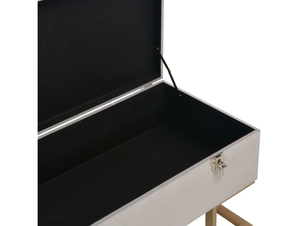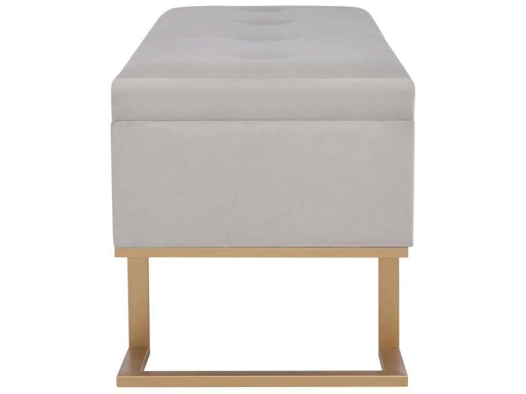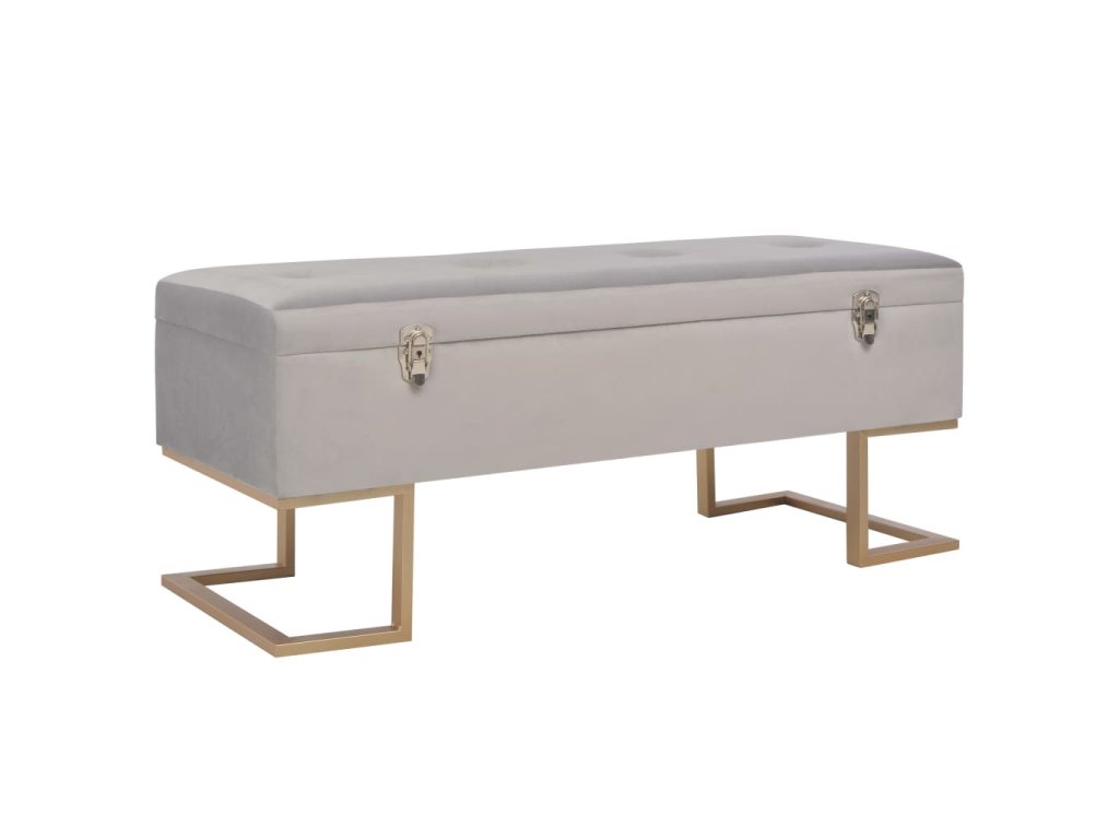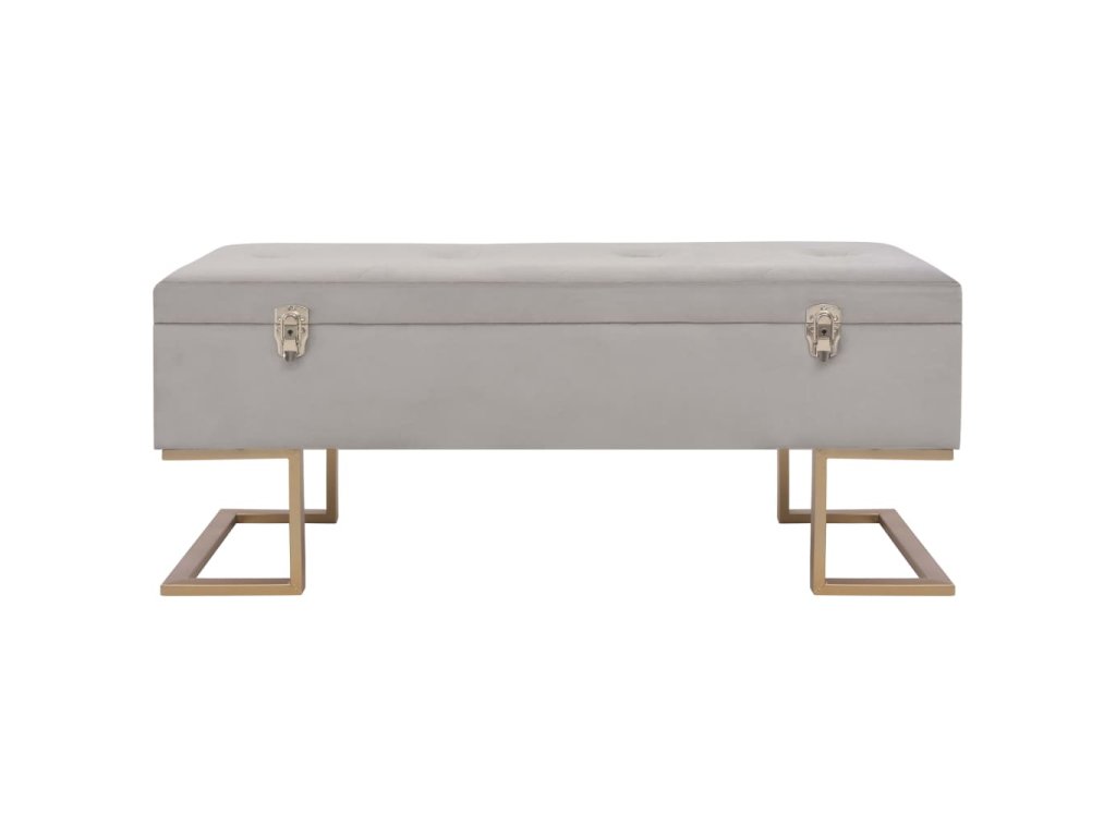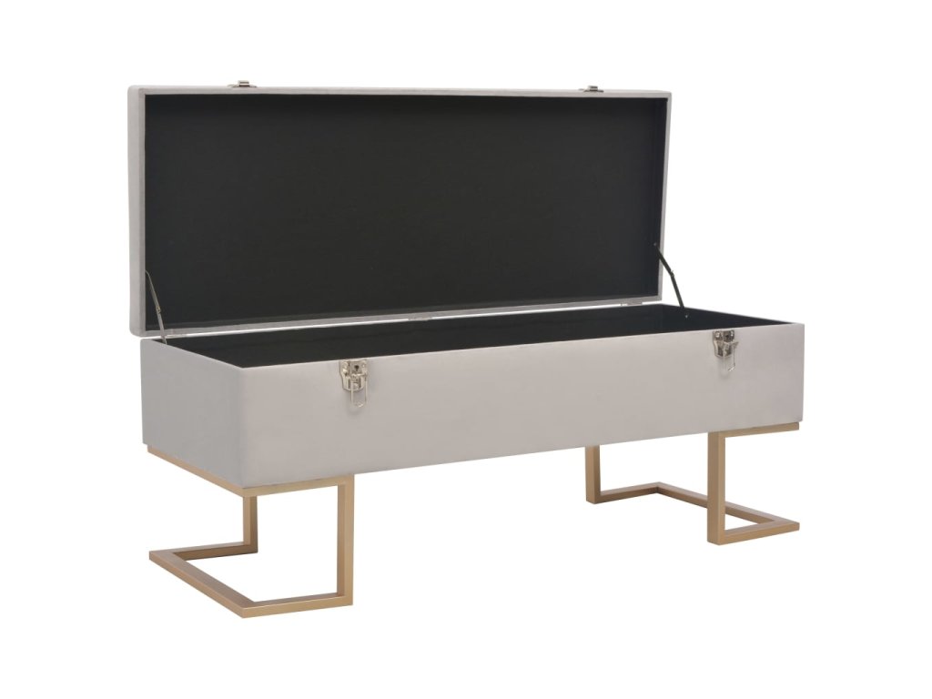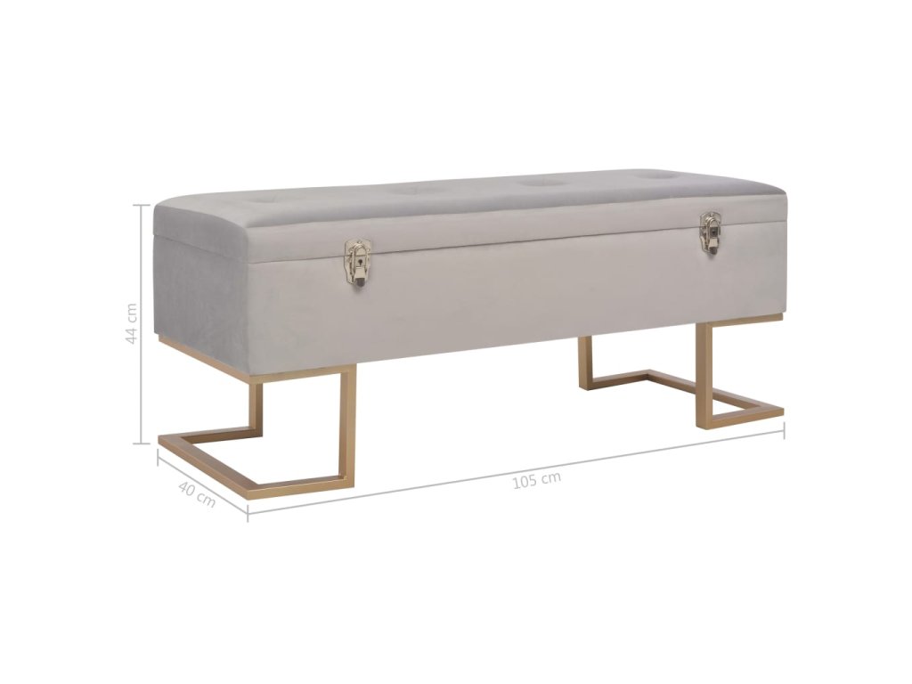 Sametové čalounění v šedé barvě je měkké na dotek a velmi pohodlné a svou barvou oživí každý interiér. Disponuje vestavěným úložným prostorem, který poskytuje dodatečné místo pro uschování nejrůznějších věcí. Nohy ze železa s práškovým nástřikem a zlatým nátěrem lavičce dodávají na stabilitě a životnosti. Naše lavice vnese do vašeho interiéru autentické kouzlo a stane se nedílnou součástí vašeho pokoje.