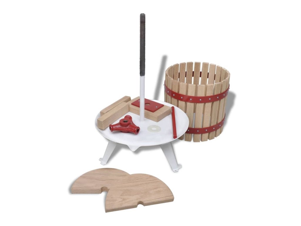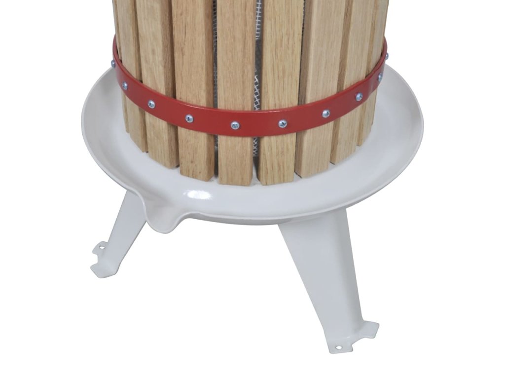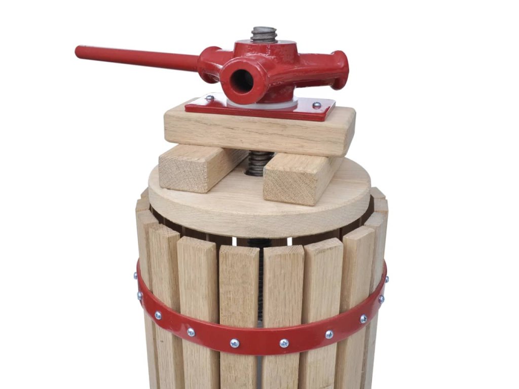 Náš lis kombinuje to nejlepší z moderních materiálů se starými světovými tradicemi a může jej snadno ovládat jediná osoba. Soudek z dubového dřeva nevyžaduje prakticky žádnou údržbu a litinové vybavení je odolné proti rezavění. Silná litinová šroubová tyč s rukojetí umožňuje uživateli, aby stál nad soudkem a využil tak své těžiště, aby vyvinul větší tlak a tím pádem získal více šťávy. Koš z masivního dubového dřeva sedí na základně z oceli s práškovým nástřikem, na níž rovněž najdete výlevku.