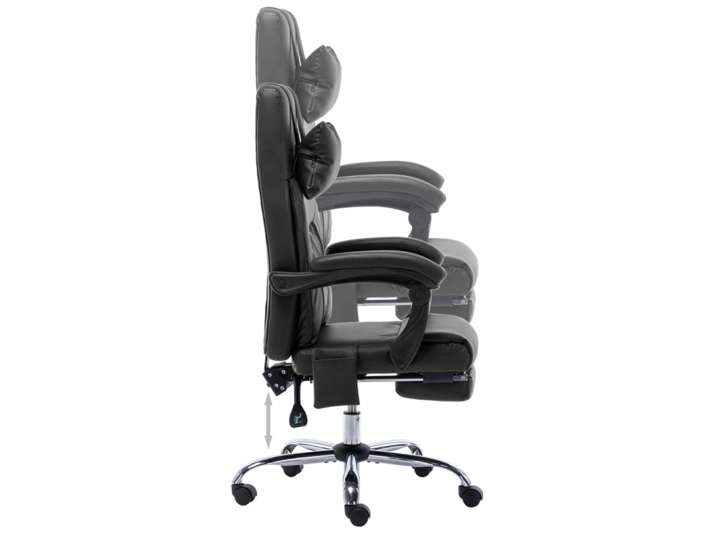 Židle má vysoké opěradlo a šíjový polštář s jednobodovou masáží, zaoblené područky, podnožku a hustě polstrovaný sedák, aby se vám na ní dobře sedělo i během dlouhých pracovních dnů. Její výšku lze nastavit, takže ji bez problémů přizpůsobíte výšce psacího stolu, a dosáhnete tak maximálního pohodlí i zdravé pozice páteře. Polohovací křeslo je vybavené nylonovými pojezdovými kolečky pro snadný pohyb. Navíc se dá sklopit do úhlu 95° až 135°, což vám umožní najít si tu nejpříjemnější polohu k odpočinku.