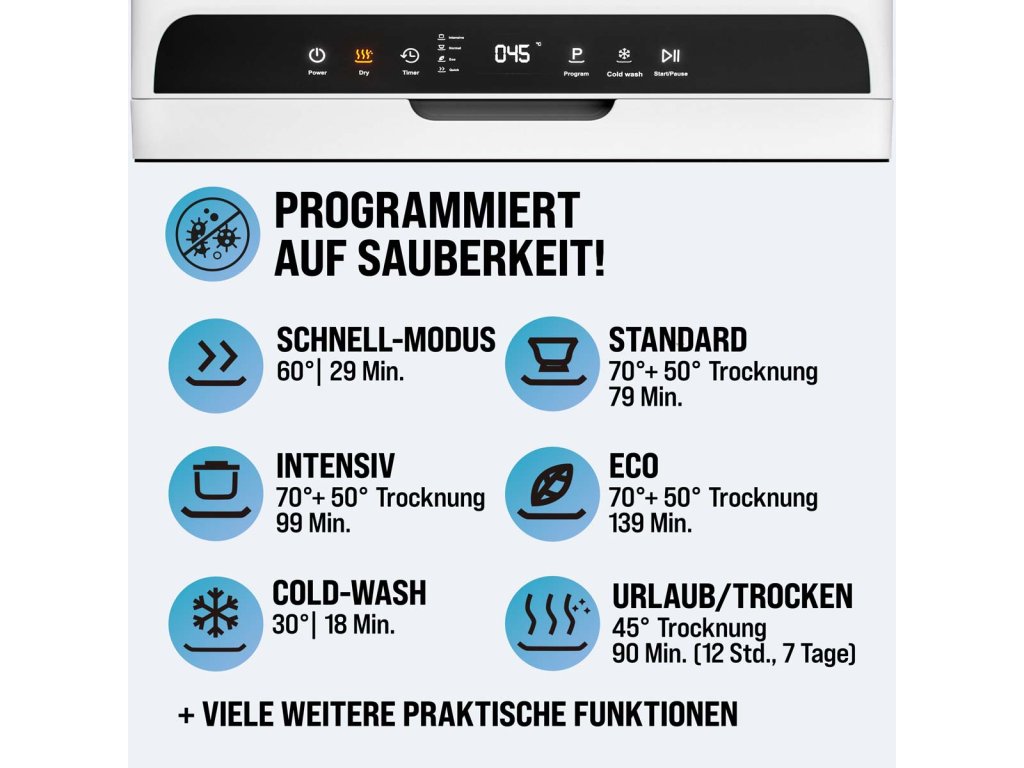 Ušetřete místo a čas díky kompaktní a výkonné mini myčce MONZANA®, která se vejde do každé kuchyně, garsonky nebo i na chalupu. Díky rozměrům 46 × 45 × 44 cm a možnosti plnění nádrže bez potřeby trvalého připojení k vodě je ideálním řešením nejen domů, ale i na cesty, do obytných vozů nebo do malých bytů.