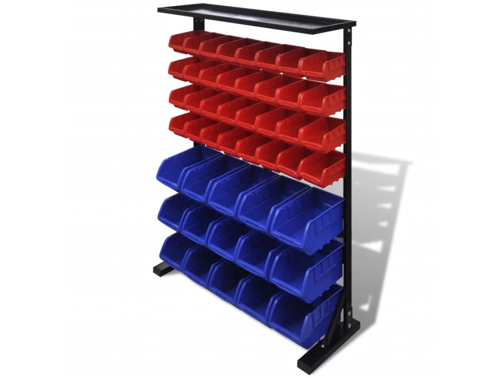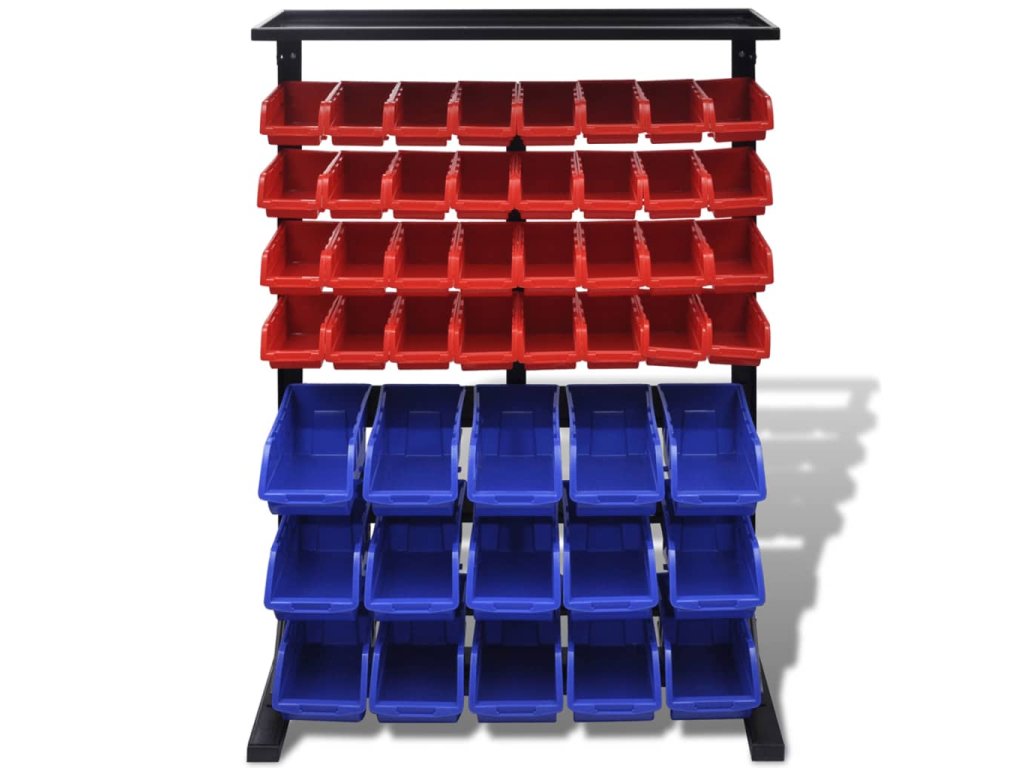 Tento organizér je nezbytností pro každou dílnu . Je ideální pro skladování drobností , příslušenství , nářadí a jiných věcí . 47 vyjímatelných a stohovatelných košíků je uložených na regálech v 7 řadách . Je vyroben z hustého polypropylenu , košíky jsou odolné vůči vysokým teplotám a většině průmyslových rozpouštědel . Vrchní část je nadizajnovaná na skladování klíčů , šroubováků , kladiv a jiného nářadí a příslušenství , zatímco košíky jsou vynikající na matice , šrouby a jiné drobné části . S touto sadou košíků po ruce udržíte ve své dílně dokonalý pořádek .