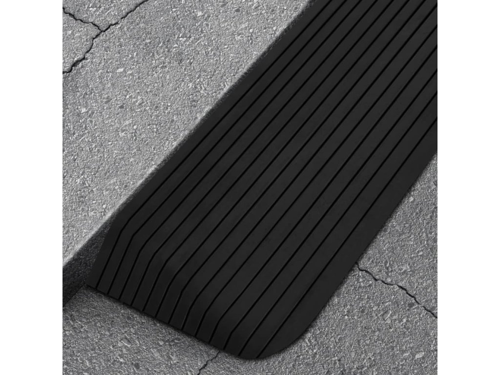 Silniční rampa je vyrobená z robustní pryže, takže je lehká, odolná a má dlouhou životnost. Drsný povrch s protiskluzovou strukturou brání sjetí nebo sklouznutí koleček při najíždění nahoru.