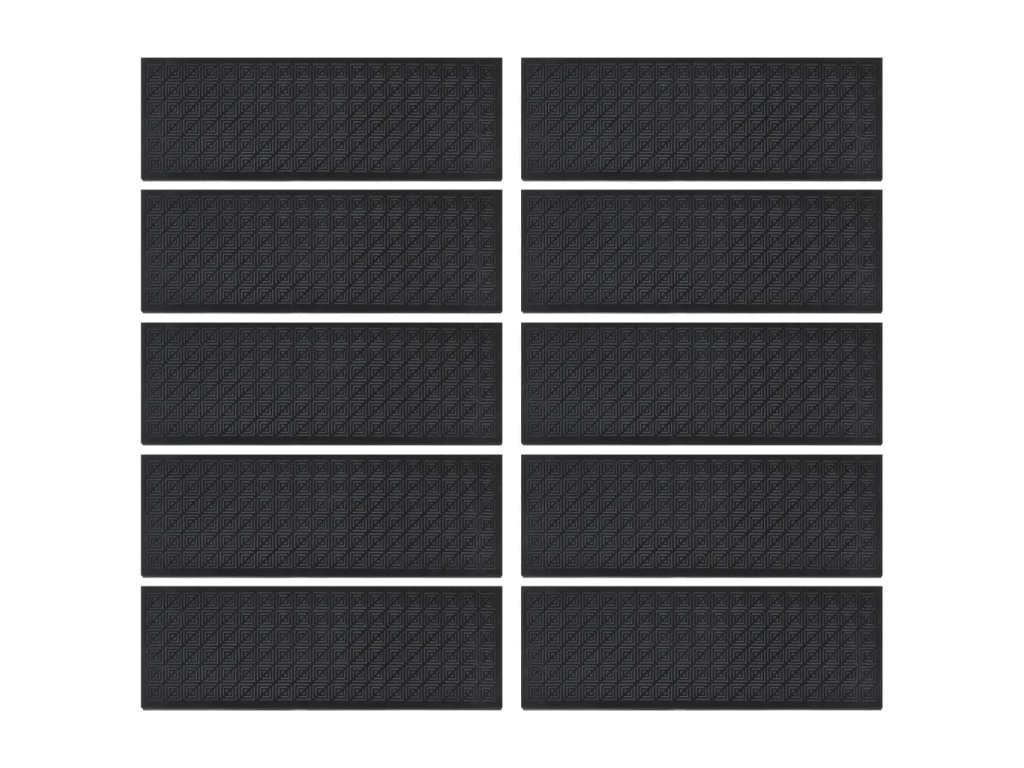 - Odolný materiál: Nášlapy na schody jsou vyrobeny z pružné gumy odolné proti opotřebení, která tlumí nárazy a zajišťuje jejich dlouhou životnost a odolnost proti skvrnám.