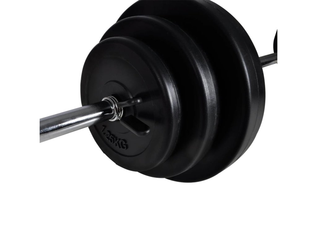 Sada činek barbell a dumbbell obsahuje silné pochromované činkové tyče s rychloupínací pružinovou objímkou (pro tyč barbell), neklouzavé rýhované rukojeti a vroubkované hvězdicové uzávěry (pro tyče dumbbell), které zajišťují bezpečné upevnění zátěžových kotoučů. Můžete tak cvičit bez obav o vaše bezpečí. Zátěžové kotouče jsou vyrobeny s robustním vrchním pláštěm z polyetylenu. Dají se kombinovat různými způsoby tak, aby vyhovovaly různým tréninkovým účelům.