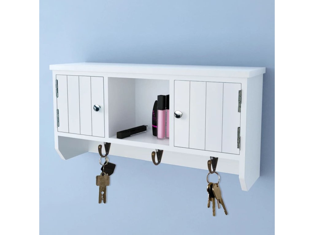 Nástěnná skříňka je opatřena třemi kovovými háčky pro zavěšení klíčů. Dvě přihrádky s dvířky a středová police poskytují dostatek prostoru pro uložení peněženek, mobilních telefonů, slunečních brýlí, šperků nebo jiných doplňků.