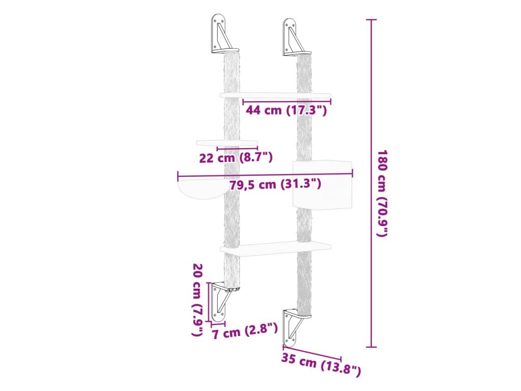 - Robustní konstrukce: Kočičí strom na stěnu je vyztužen robustními trojúhelníkovými podpěrami, které zajišťují bezpečnost a stabilitu a umožňují vaší kočce volně si hrát a odpočívat.