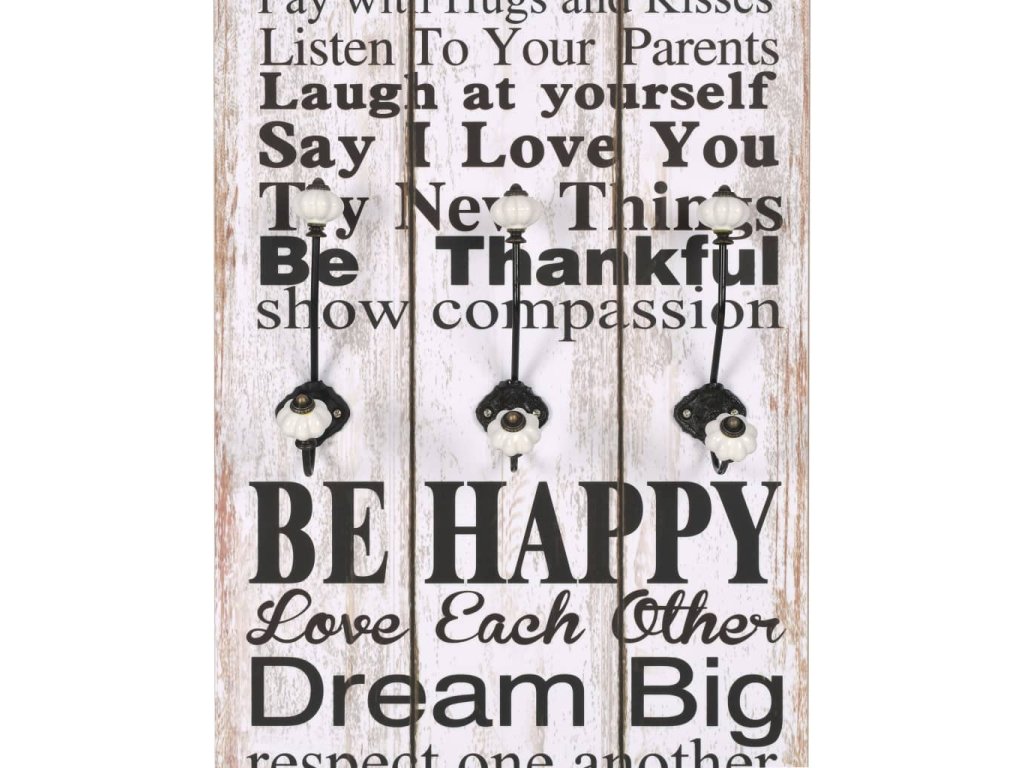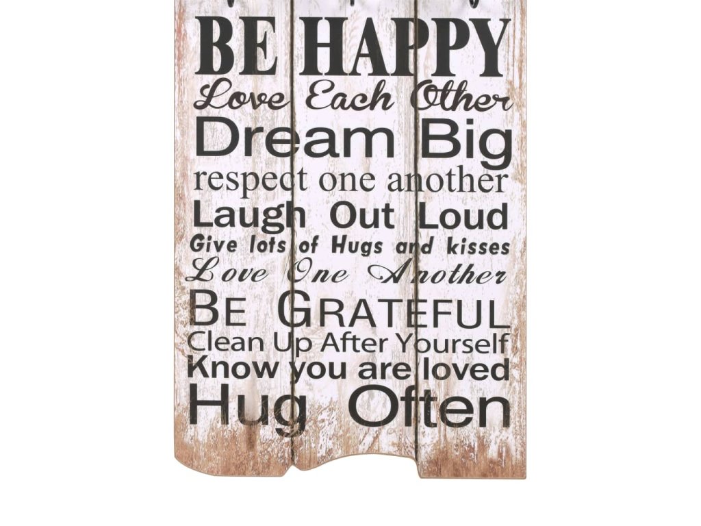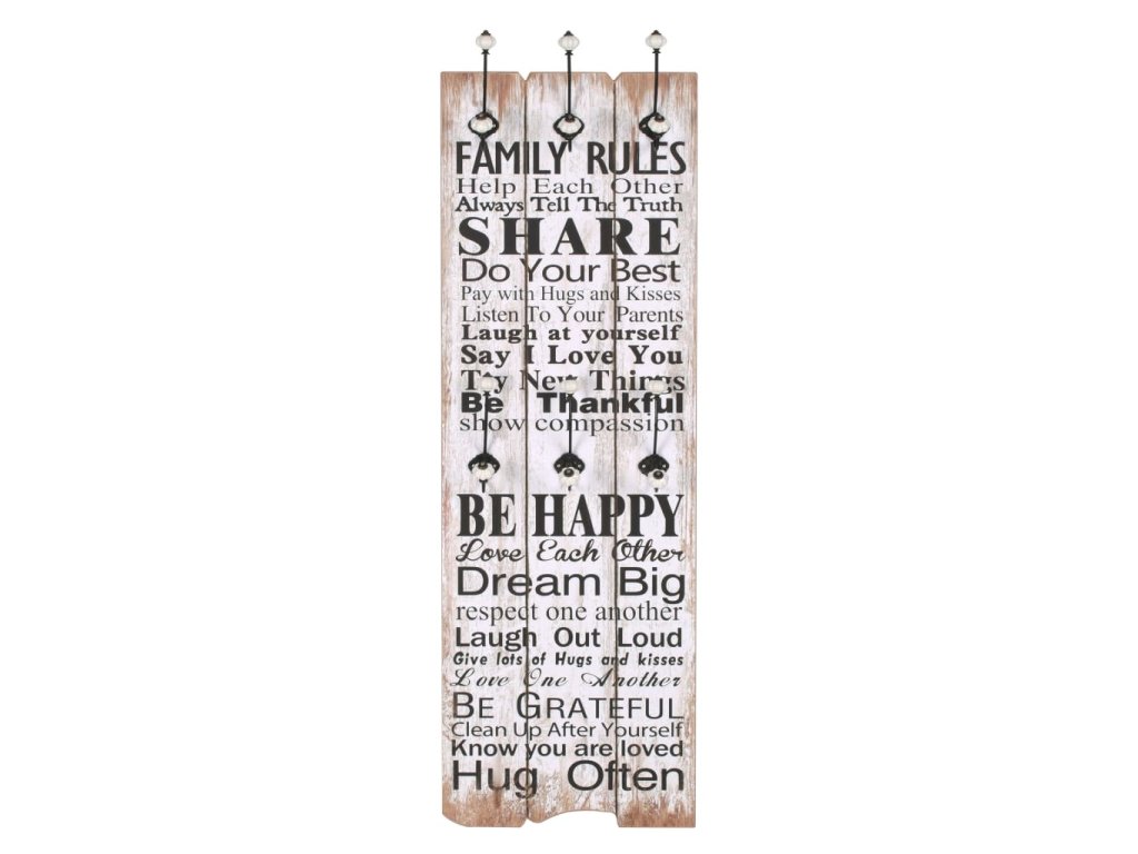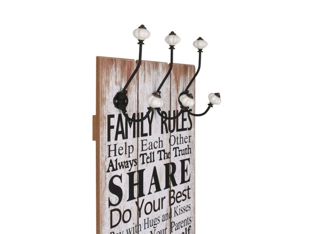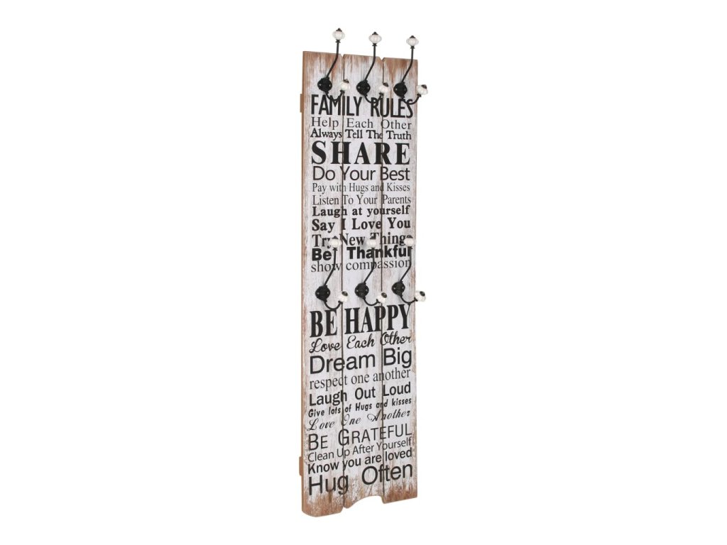 Tento nástěnný věšák s 6 háčky vaše hosty okamžitě na první pohled zaujme svým nápisem ve vintage stylu, jenž říká „Family rules Share Be happy Dream big Hug often." (Rodinná pravidla, sdílej, buď šťastný, měj velké sny, objímej často.)