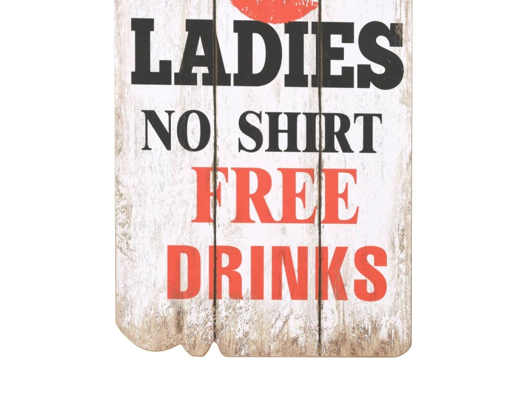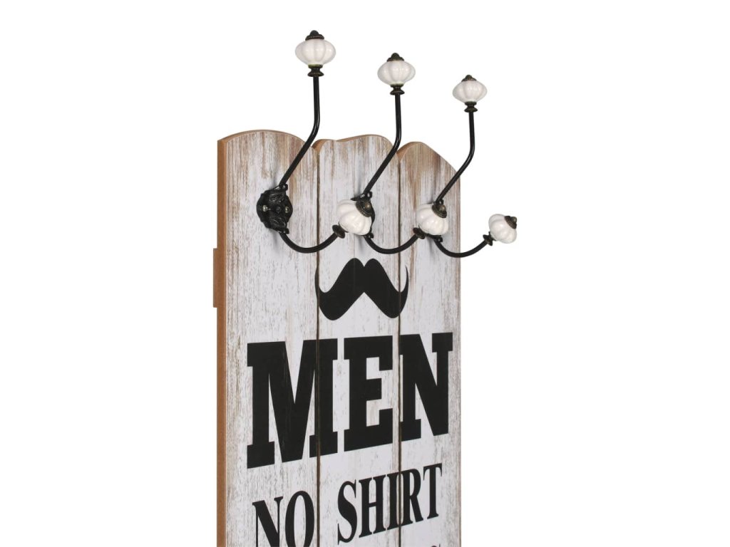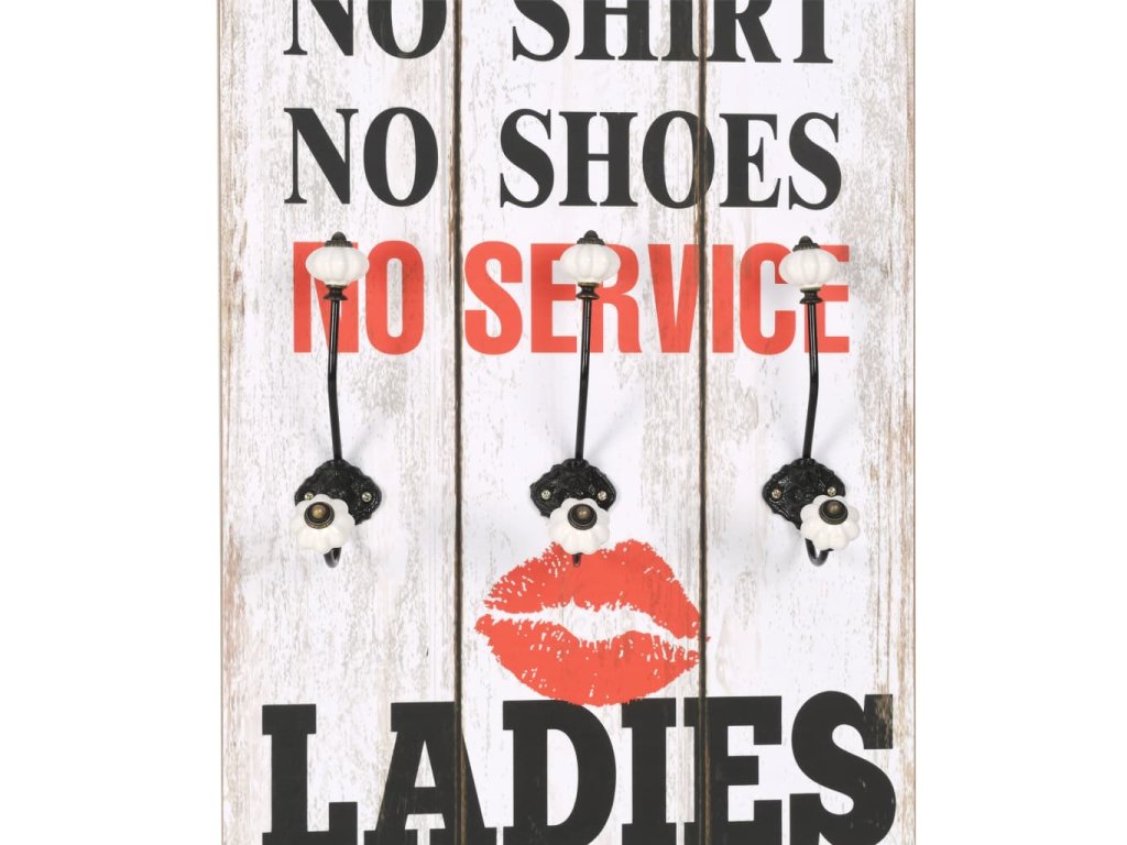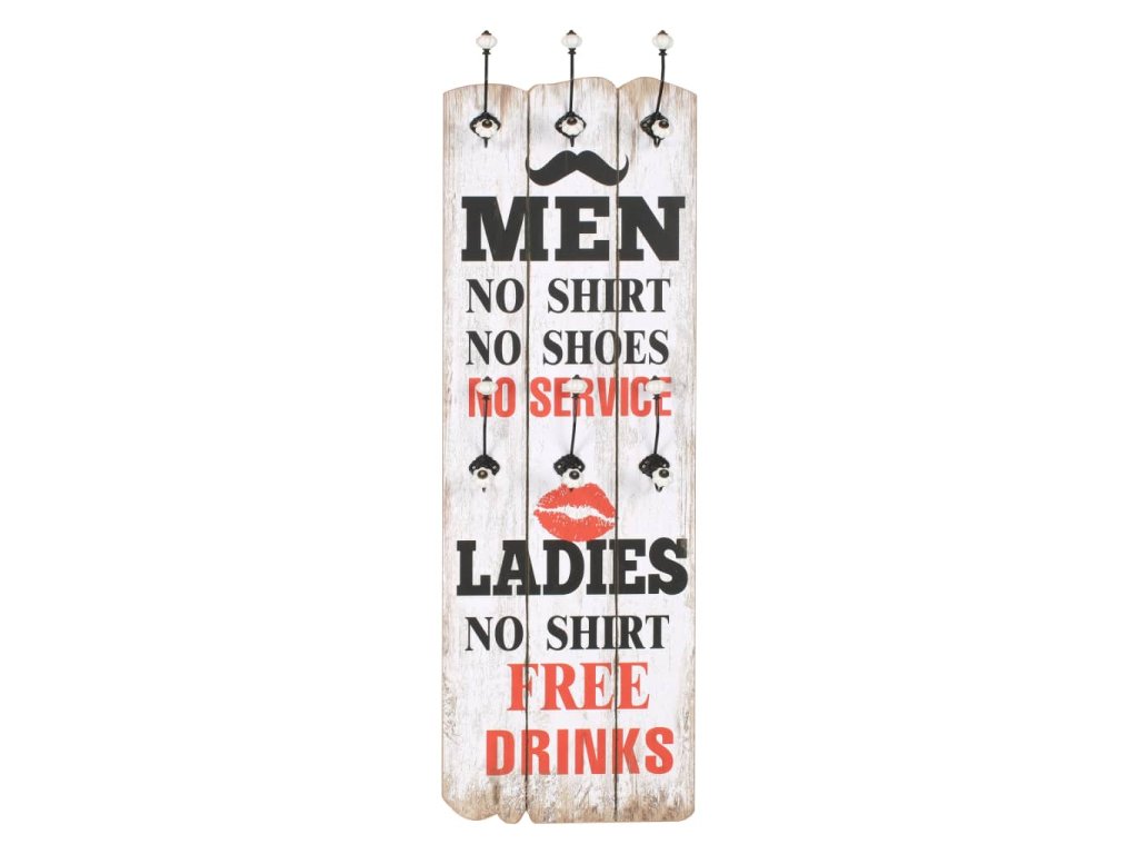 Tento nástěnný věšák s 6 háčky vaše hosty okamžitě na první pohled zaujme svým nápisem ve vintage stylu, jenž říká „Men no shirt no shoes no service ladies no shirt free drinks.“ (Pánové bez trička a bez bot bez obsluhy, dámy bez trička pití zadarmo.)