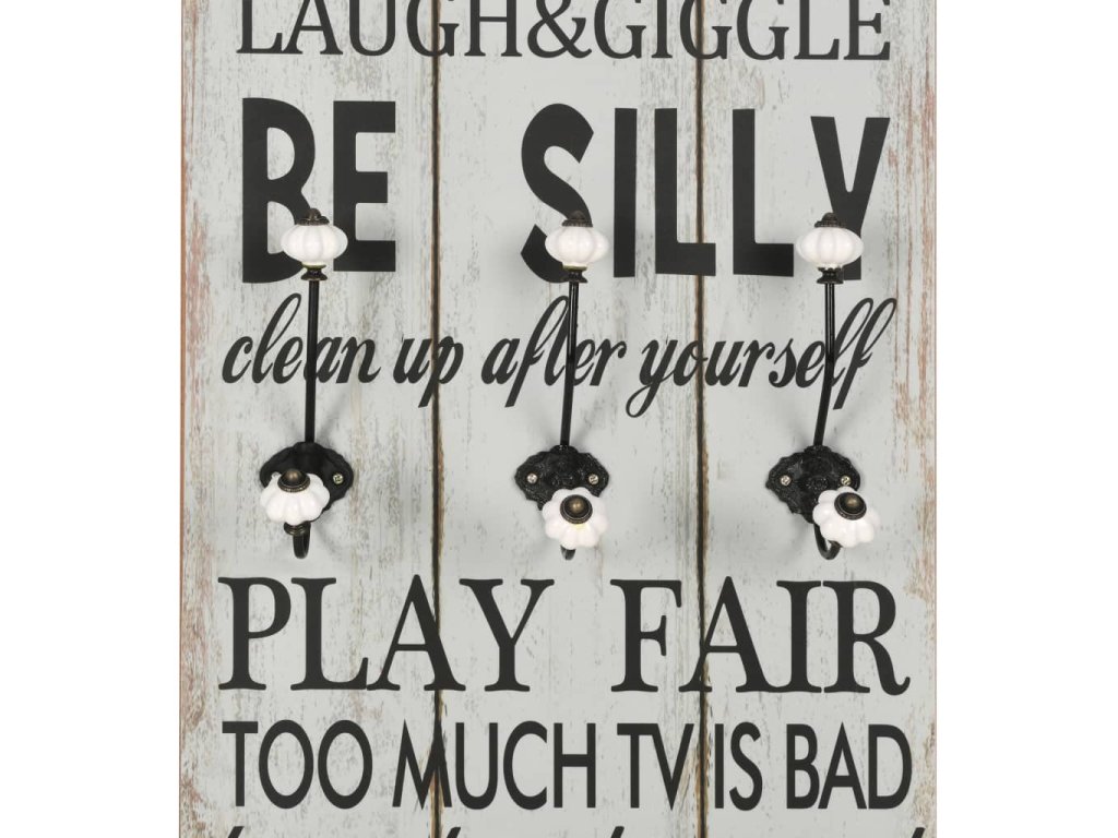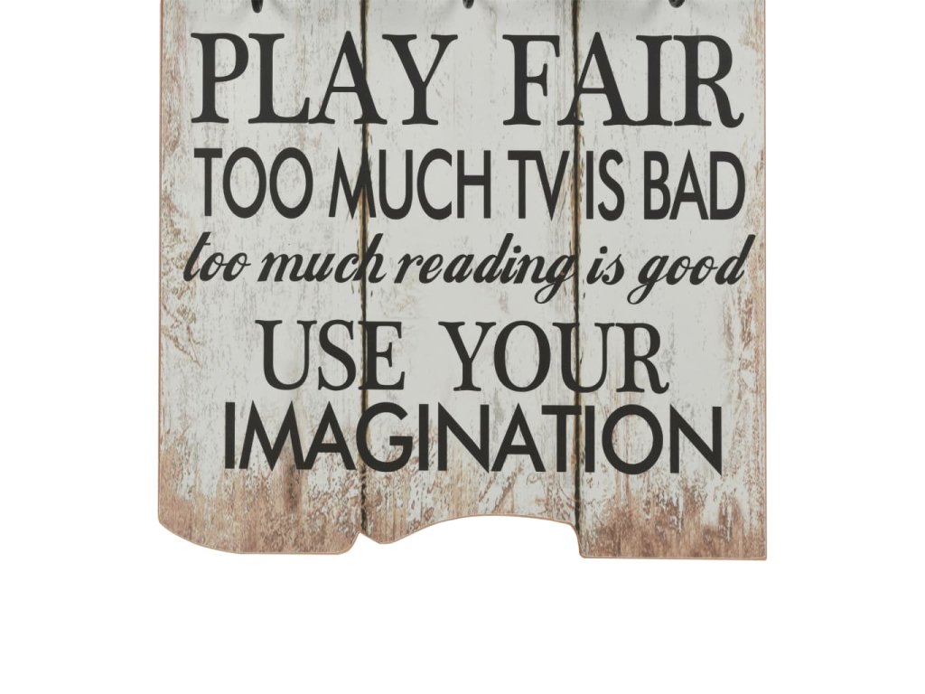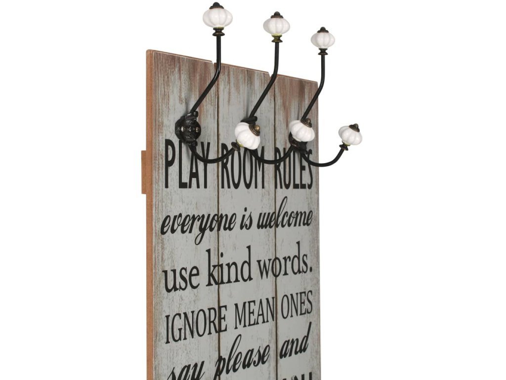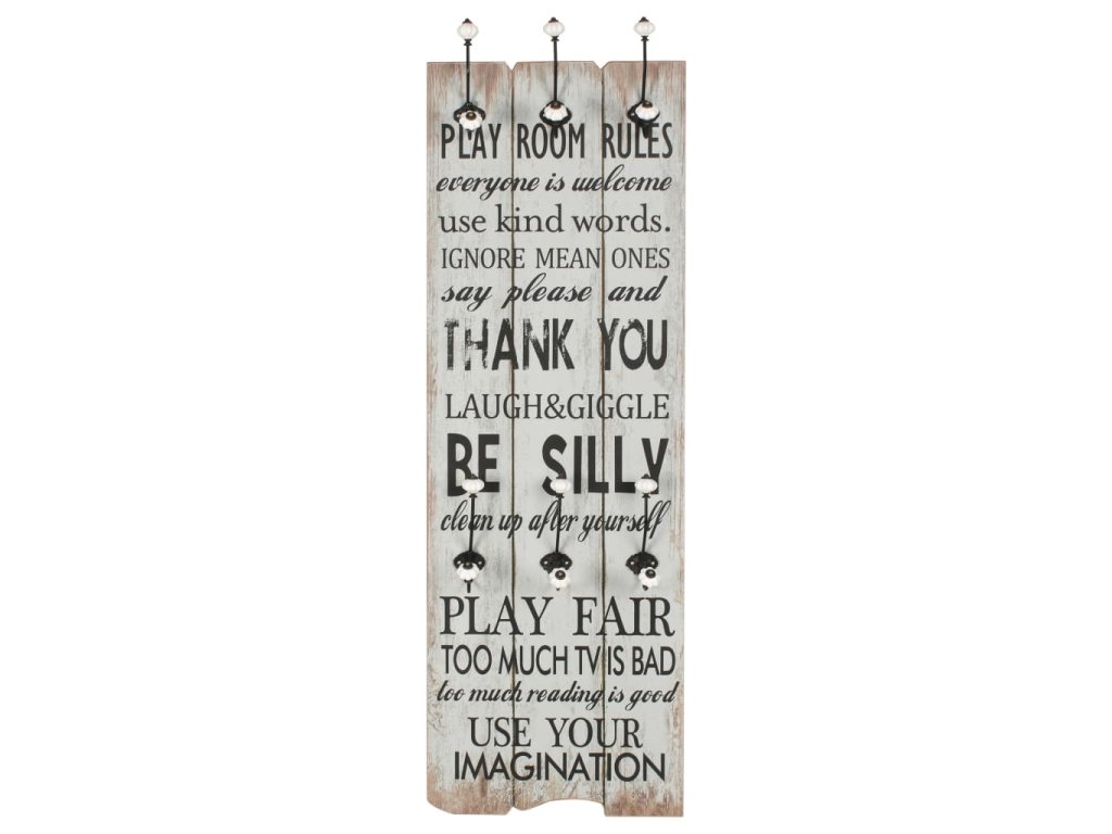 Tento nástěnný věšák s 6 háčky vaše hosty okamžitě na první pohled zaujme svým nápisem ve vintage stylu, jenž říká „Play room rules Ignore mean ones Thank you Be silly Play fair Use your imagination" (Pravidla herny – ignoruj zlost – říkej prosím a děkuji – odvaž se – hraj férově – používej svou fantazii.)