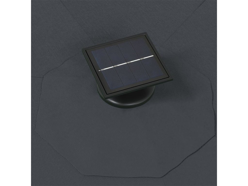 Slunečník je vyrobený z polyesteru, který je odolný vůči UV paprskům a blednutí barev. Poskytne vám tudíž optimální ochranu před sluncem a snadno se čistí. Slunečník má také exkluzivní sklopný design, takže když začne slunce odpoledne klesat k obzoru, můžete ho sklopit a zůstat v příjemném stínu. Stabilitu a odolnost slunečníku zajišťuje silná kovová tyč spolu s 8 odolnými žebry. Zahradní slunečník jednoduše otevřete a zavřete klikovým mechanismem. A chcete-li si večer vytvořit útulné a romantické prostředí, stačí rozsvítit 28 integrovaných LED světel.