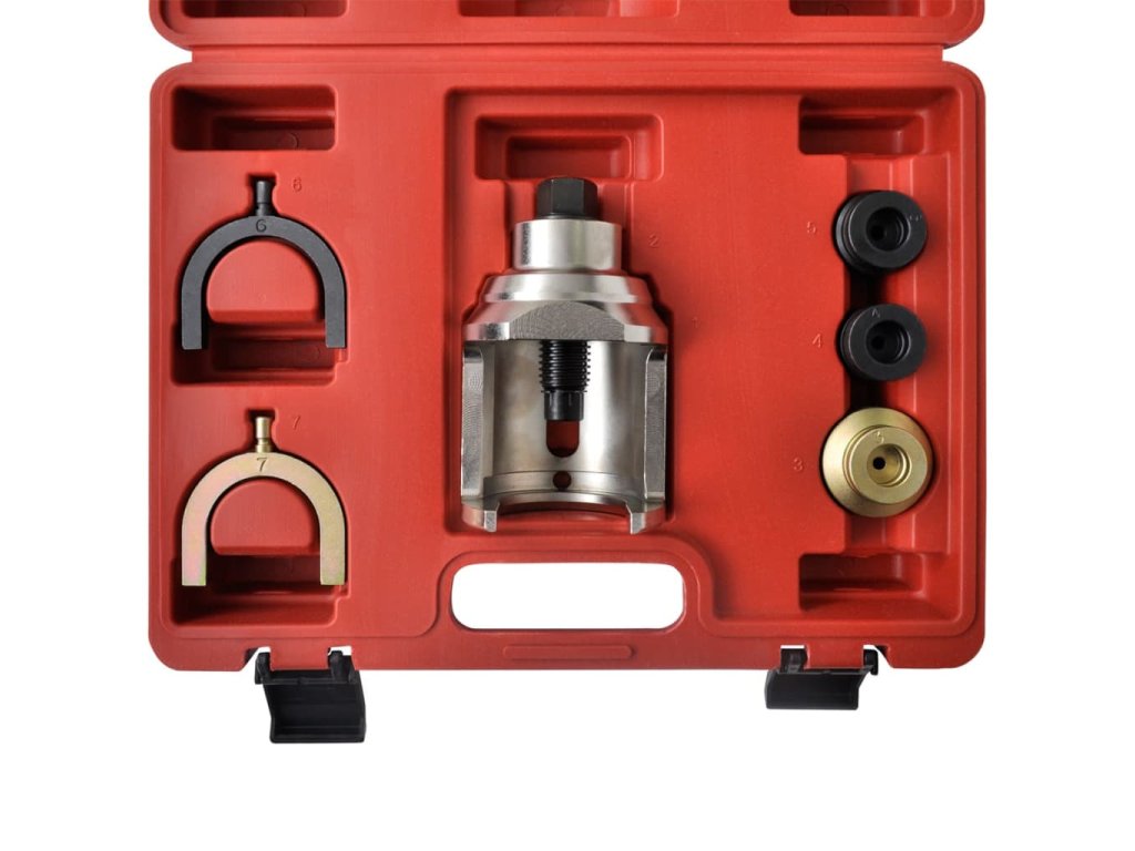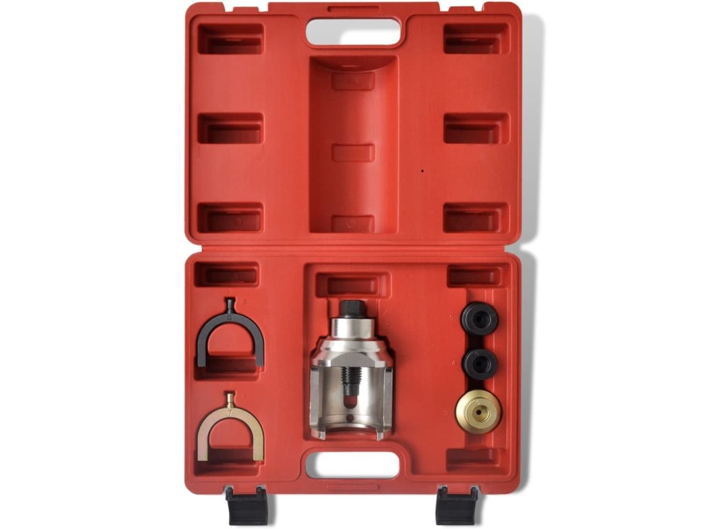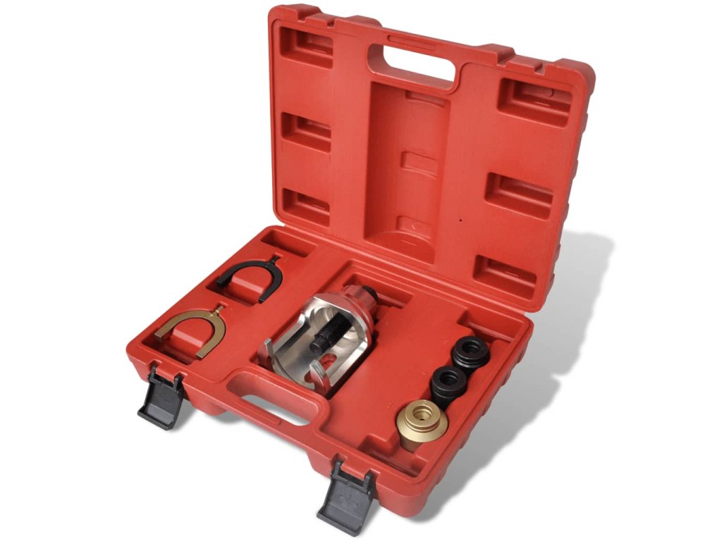 Tento set nástrojů pro montáž a demontáž nosných kulových čepů je vyroben z kvalitní uhlíkové oceli, je vhodný pro profesionální mechaniky a je speciálně navržen pro VW T4 přední nápravy. Je určen pro demontáž a montáž suspenze kulových kloubů na vozidlech bez odstranění pomocného rámu.Všechny přípravky různých velikostí jsou uloženy v praktickém plastovém pouzdře. To zajistí lepší přehlednost a snadnou přepravu.