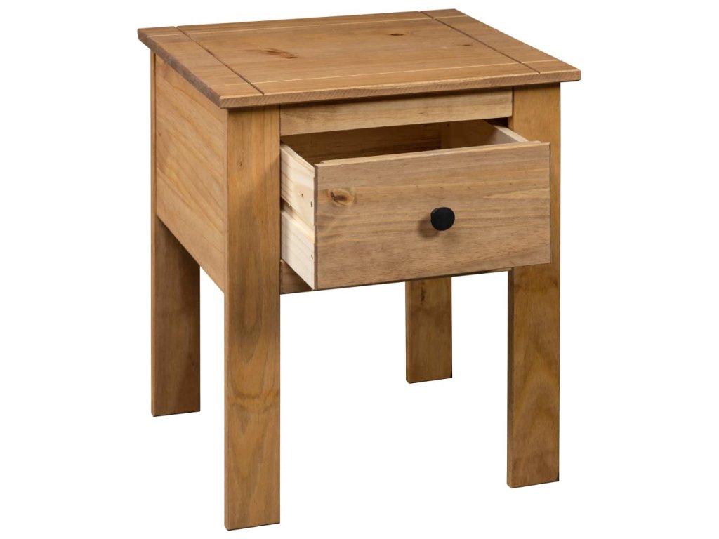 Noční stolek je vyroben z masivního borového dřeva a je vysoce stabilní a odolný. Robustní horní deska je ideální pro vystavení dekorativních předmětů, jako jsou vázy nebo rostliny v květináčích. Skříňka poskytuje dostatek úložného prostoru pro úhledné uspořádání různých předmětů. Tento noční stolek se navíc snadno čistí suchým hadříkem.