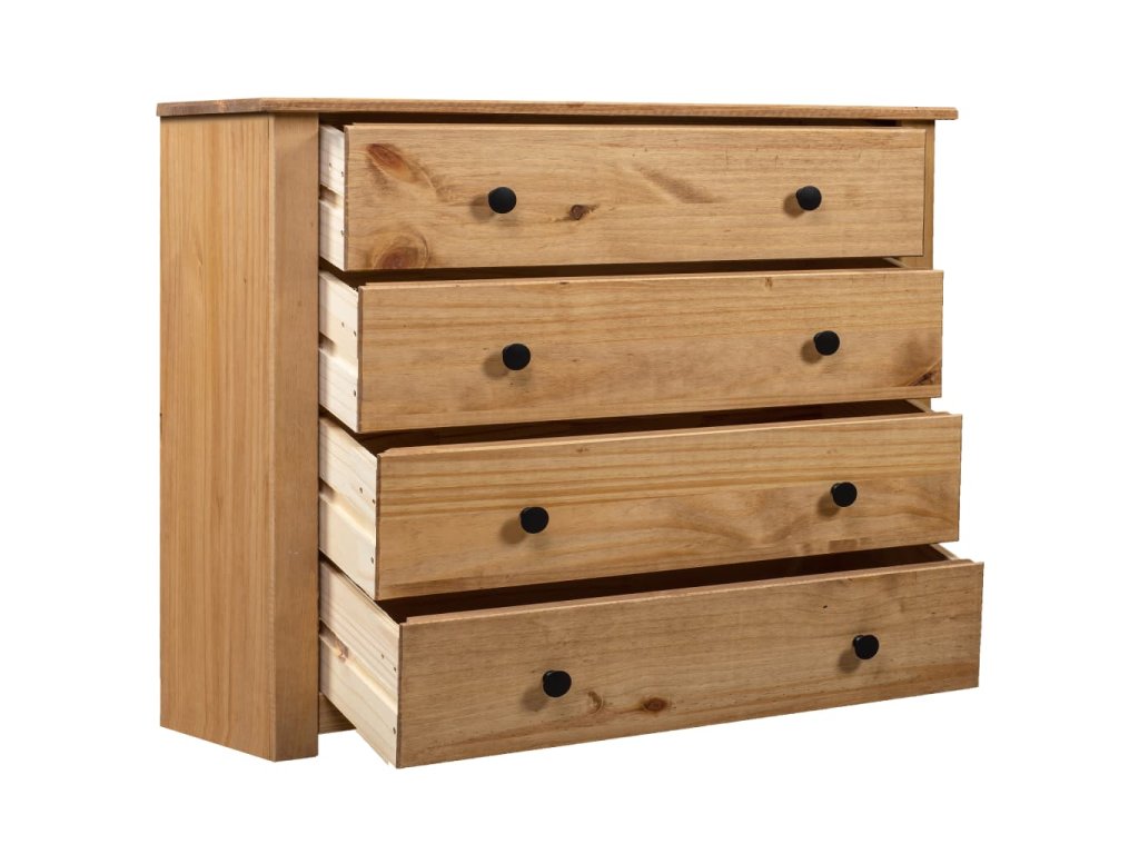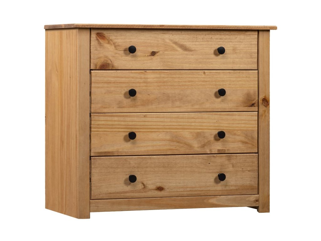 Tato komoda Panama je vyrobená z masivního borovicového dřeva a je mimořádně odolná a robustní. Příborník nabízí velký úložný prostor se 4 zásuvkami. Robustní horní deska je ideální pro vystavení dekorativních předmětů, fotorámečků nebo pokojových rostlin. Snadno se otírá suchým hadříkem. Servírovací stojan se také snadno sestavuje.