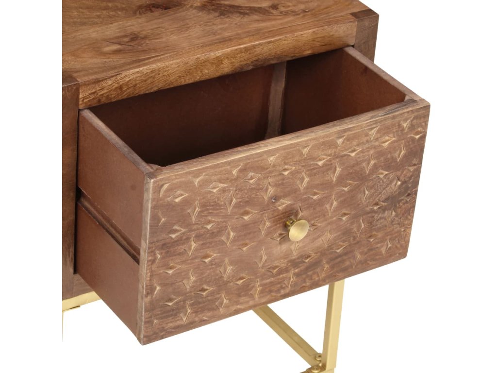 Noční skříňka s ručně vyřezávaným vzorem na čelní straně je zhotovená z masivního mangovníku, což je husté a robustní tvrdé dřevo, jehož povrch se vyznačuje hnědými či zlatými pruhy a konturami. Každá fáze výrobního procesu je prováděná s mimořádnou péčí, ať už se jedná o leštění nebo lakování. Řemeslné zpracování pak podtrhuje působivé retro vzezření nábytku. Krásná kresba dřeva dává každému kusu nábytku jedinečný charakter, jímž se lehce liší od všech ostatních. Práškově lakovaný ocelový rám působí industriálním dojmem. Skříňka má také jednu zásuvku, kde najdete spoustu prostoru k přehlednému uložení všech možných maličkostí na dosah ruky. Sestavení produktu je jednoduché.