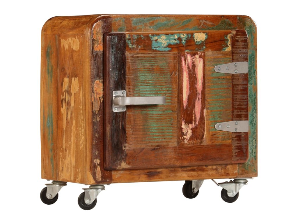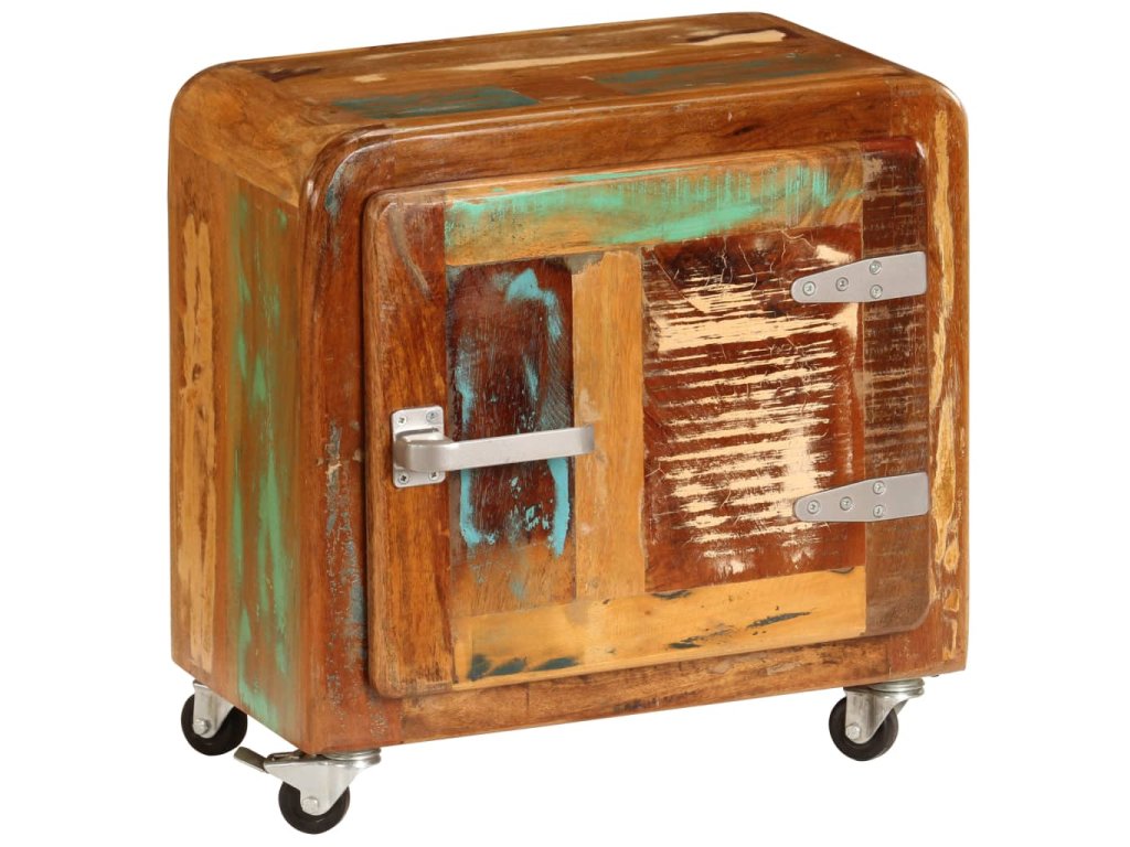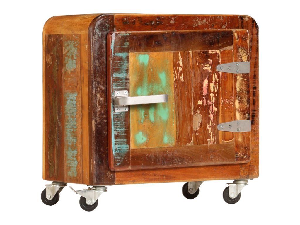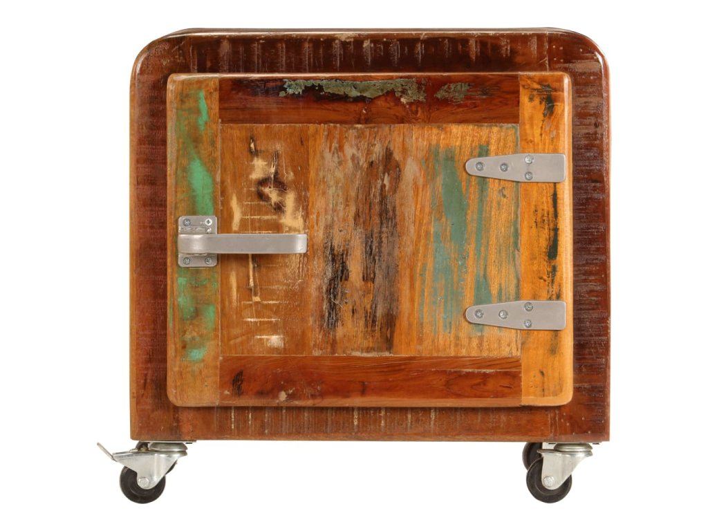 Noční stolek je vyrobený z masivního recyklovaného dřeva, které pochází z trámů, podlah a podpěrných nosníků starých budov určených k demolici. Sestává tedy z různých druhů dřeva, jako jsou borovice, teak, buk, dub, cedr, mangovník, akácie apod. Recyklované dřevo tak nabývá vlastností všech těchto rozličných typů dřevin. Navíc je již zestárlé, ošlehané a vyschlé, takže se nesmršťuje ani neohýbá. Stolek je celý ručně vyrobený a atraktivní kresba dřeva ho činí naprosto jedinečným a lehce odlišným od všech ostatních. Kovové prvky dodávají stolku industriální nádech. Skříňka vám také poskytne spoustu místa, kam si můžete schovávat knížky, zápisníčky, psací potřeby a další drobnosti. Jelikož je vybavena 4 kolečky, můžete celý stolek bez námahy přesouvat.