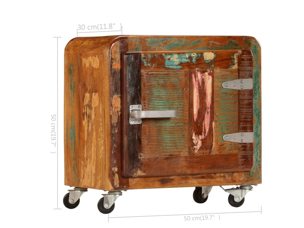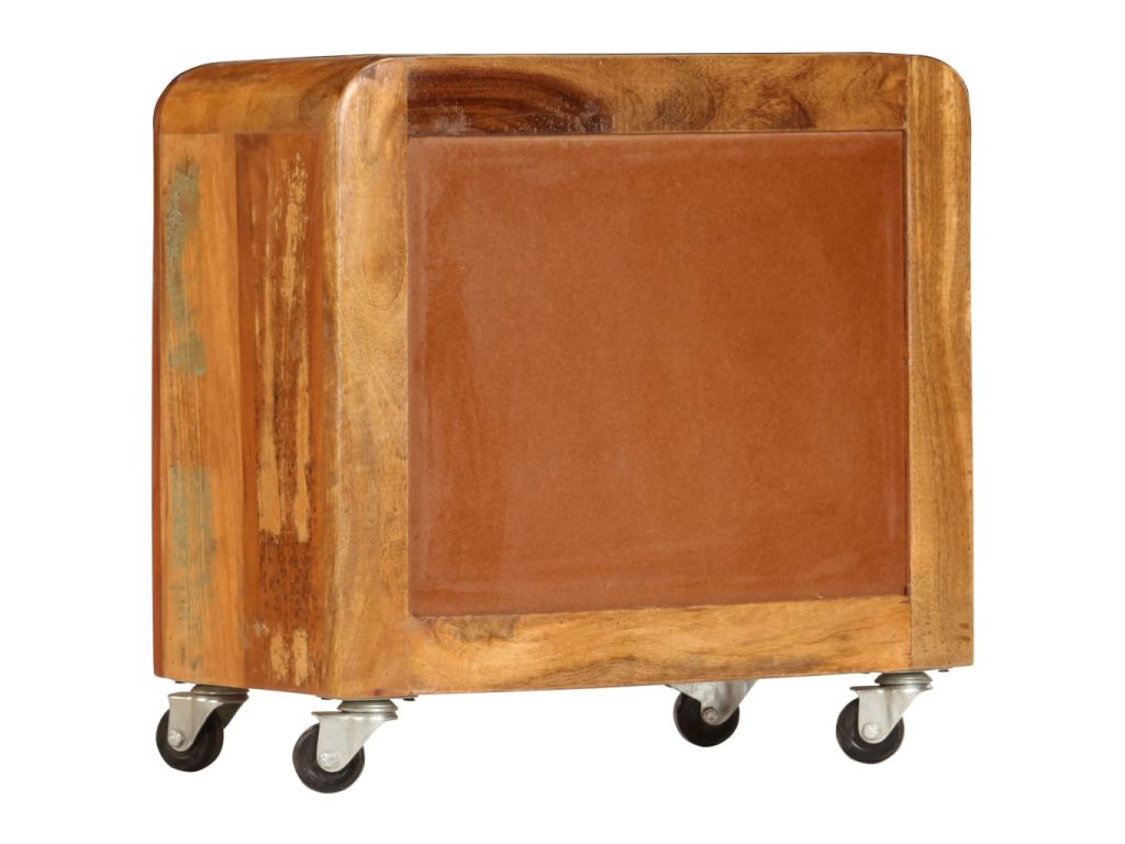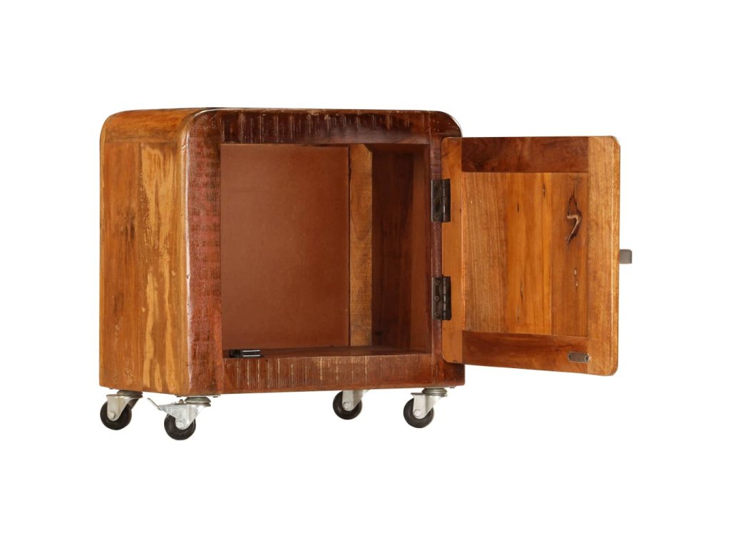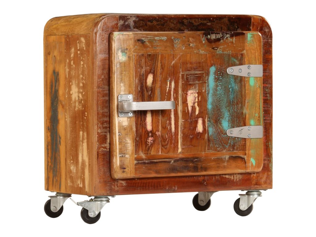 Noční stolek je vyrobený z masivního recyklovaného dřeva, které pochází z trámů, podlah a podpěrných nosníků starých budov určených k demolici. Sestává tedy z různých druhů dřeva, jako jsou borovice, teak, buk, dub, cedr, mangovník, akácie apod. Recyklované dřevo tak nabývá vlastností všech těchto rozličných typů dřevin. Navíc je již zestárlé, ošlehané a vyschlé, takže se nesmršťuje ani neohýbá. Stolek je celý ručně vyrobený a atraktivní kresba dřeva ho činí naprosto jedinečným a lehce odlišným od všech ostatních. Kovové prvky dodávají stolku industriální nádech. Skříňka vám také poskytne spoustu místa, kam si můžete schovávat knížky, zápisníčky, psací potřeby a další drobnosti. Jelikož je vybavena 4 kolečky, můžete celý stolek bez námahy přesouvat.