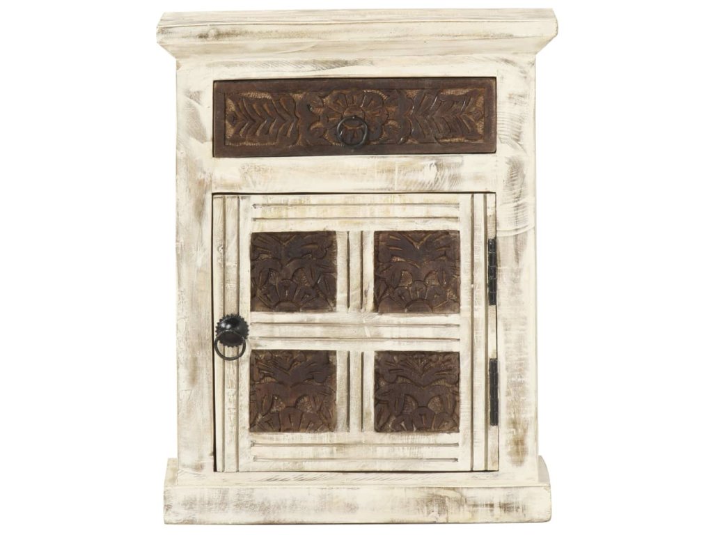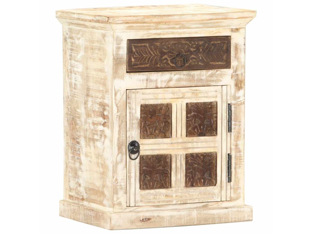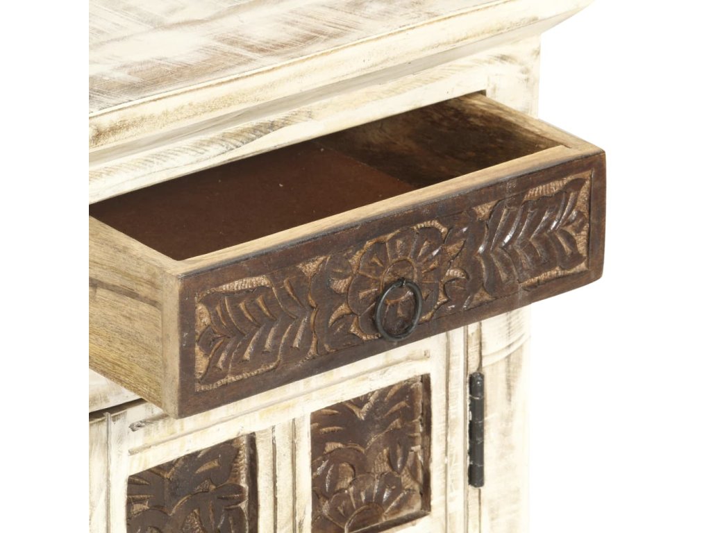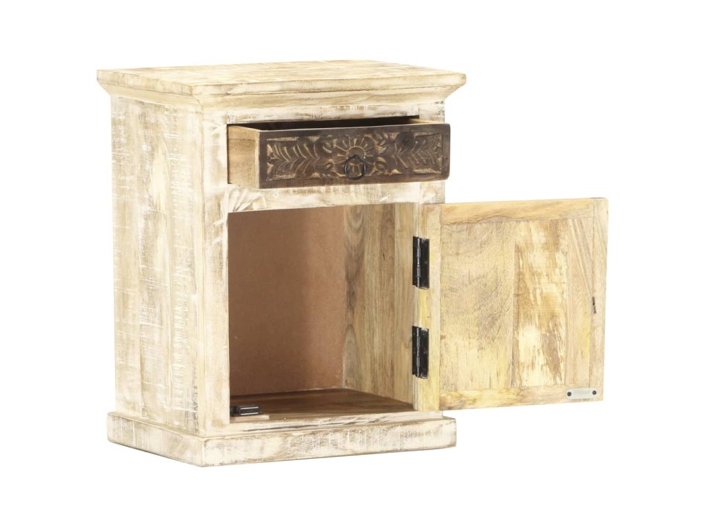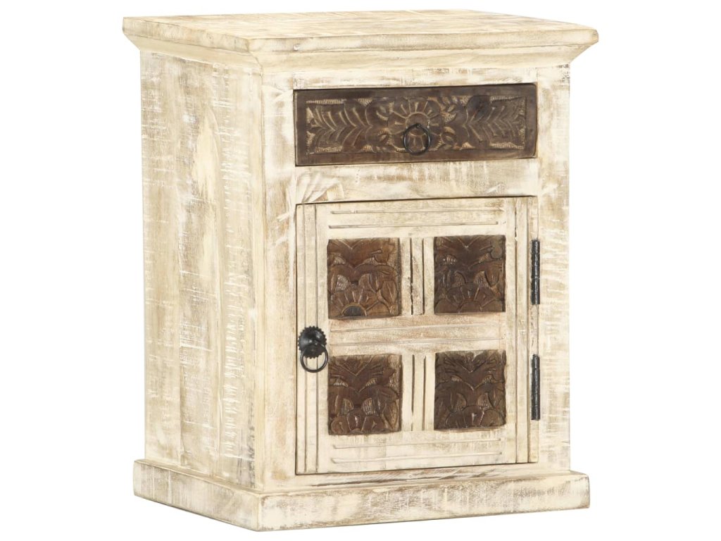 Noční stolek je vyrobený z masivního mangovníkového dřeva, což je tvrdé dřevo s hustou texturou. Hrubé mangovníkové dřevo je nejen schopné unést značnou váhu, ale výborně také odolává opotřebení a působení času. Stolek s překrásným designem je proto stabilní, odolný a příjemný na pohled. Precizní řemeslné zpracování zaručuje, že byla každému kroku výrobního procesu věnovaná mimořádná péče, ať už šlo o leštění, natírání anebo lakování. Skříňka k posteli je navržená s přihrádkou s dvířky a 1 zásuvkou s vyřezávaným vzorem, který vám navíc poskytne spoustu místa k uložení vašich zápisníčků, knížek a všelijakých dalších věcí. Produkt je již sestavený, další montáž není třeba.