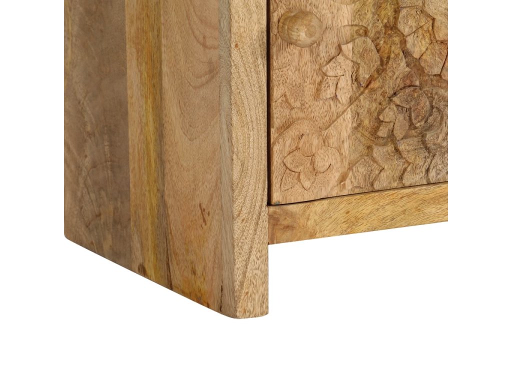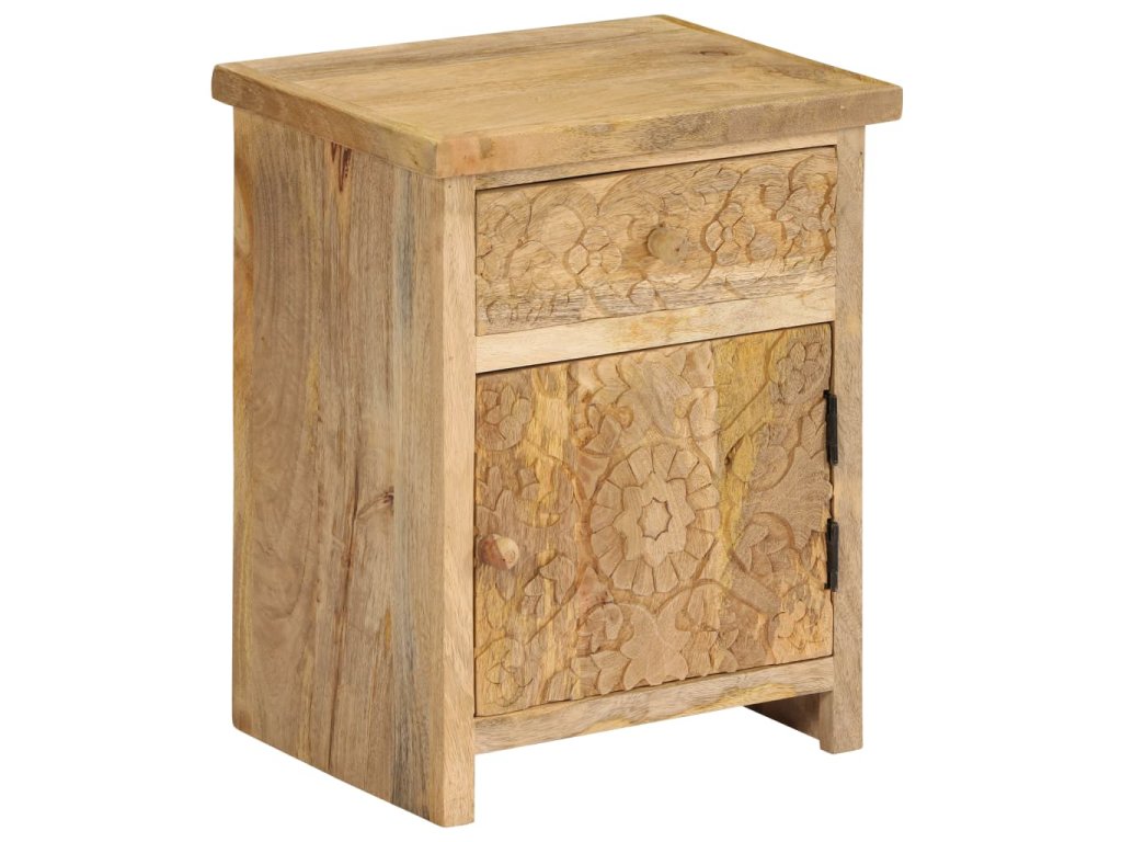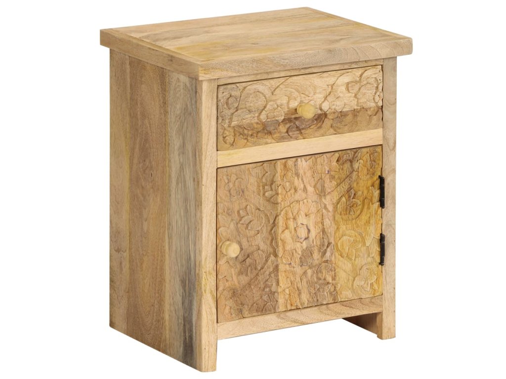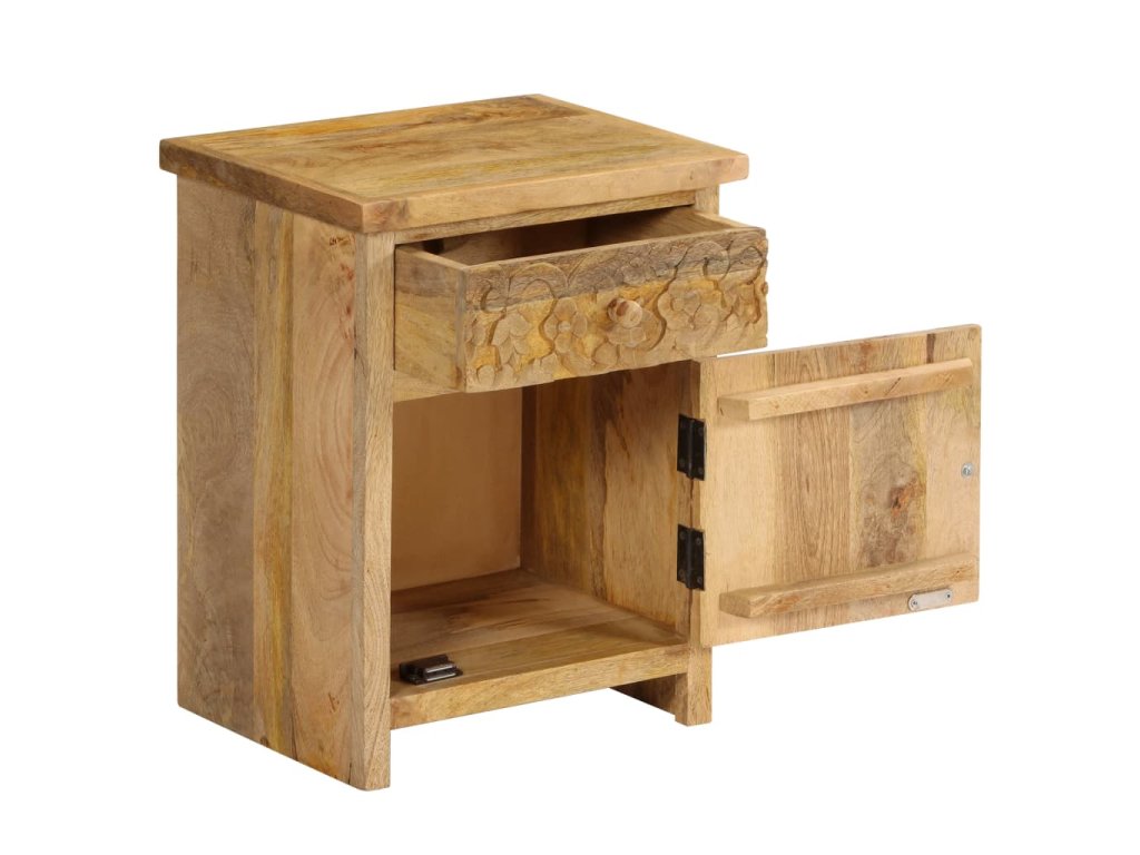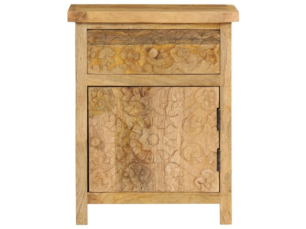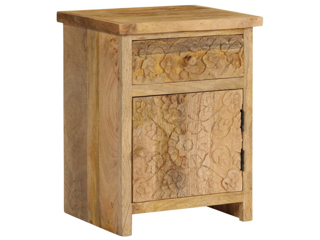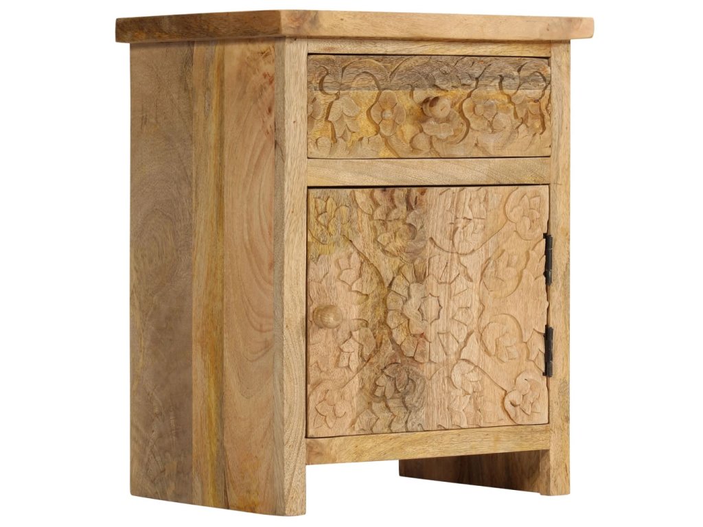 Odkládací stolek je vyroben z masivního mangovníkového dřeva a je vysoce stabilní a odolný. Pevná horní deska je ideální k odložení vašich sklenic, knih, šálků na čaj atd. Noční stolek poskytuje dostatek úložného prostoru pro úhledné uspořádání různých předmětů. Vyřezávané detaily dodávají nočnímu stolku nádech elegantního šarmu. Tento výrobek je dodávaný ve složeném stavu, montáž není nutná.