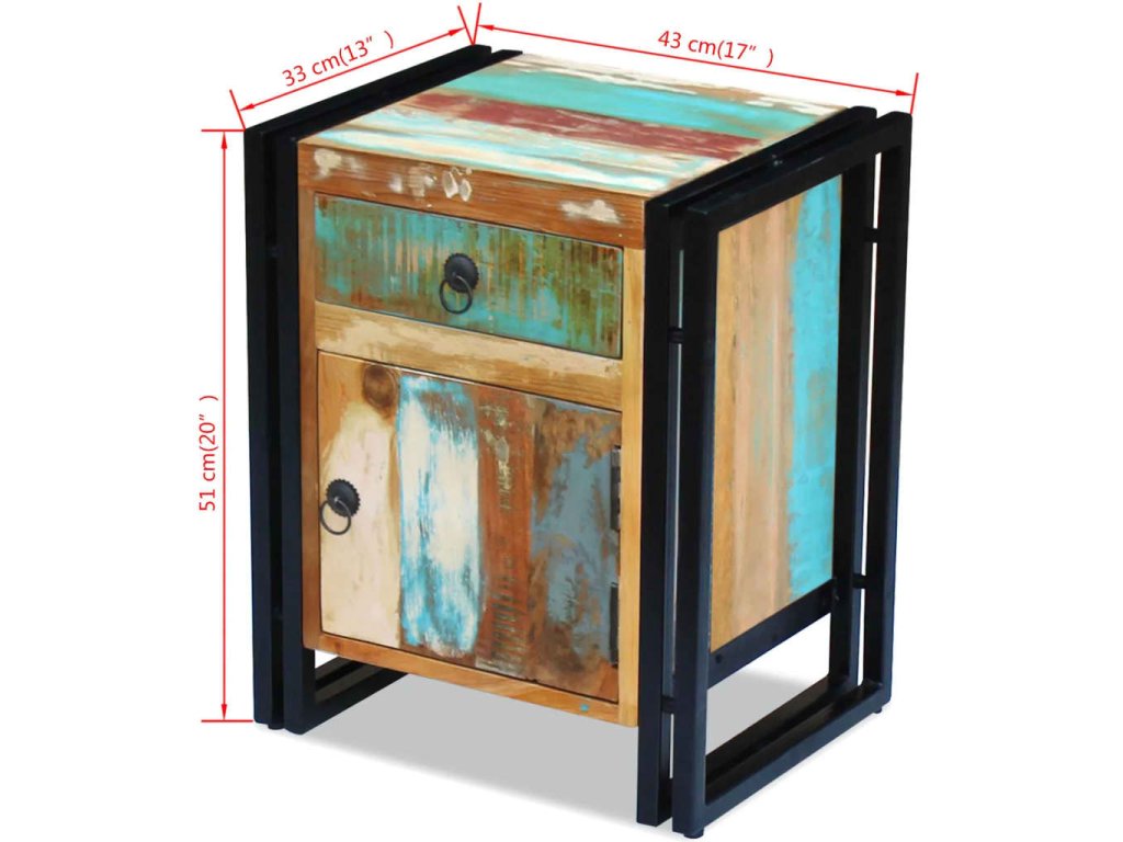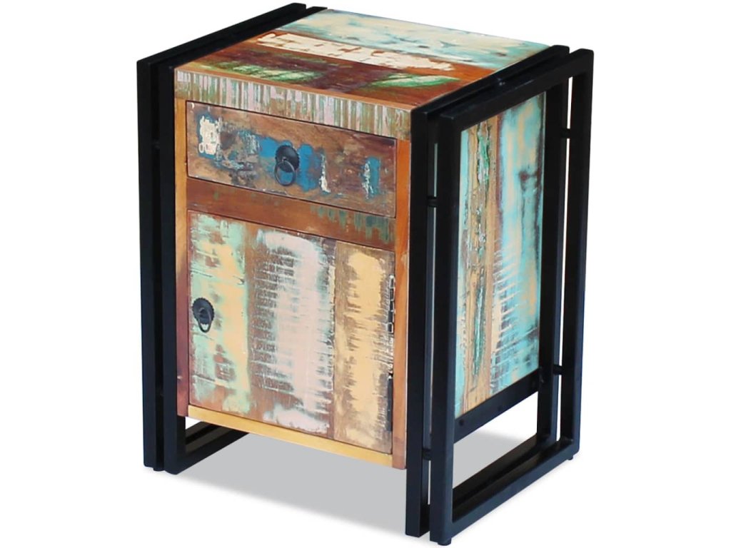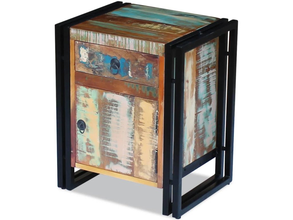 Tento noční stolek ve vintage stylu, vyrobený z masivního recyklovaného dřeva, bude nadčasovým doplňkem vašeho domova. Pevný ocelový rám dodává dřevěné skříňce na stabilitě a odolnosti. Je vybaven zásuvkou, do které lze uložit menší předměty a mít je vždy po ruce, a přihrádkou s dvířky, která poskytuje další úložný prostor. Noční stolek lze použít také jako odkládací skříňku nebo stolek na telefon.