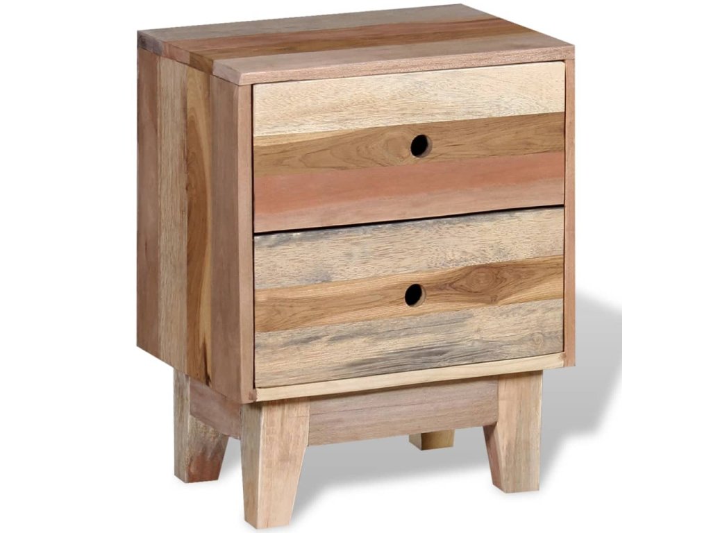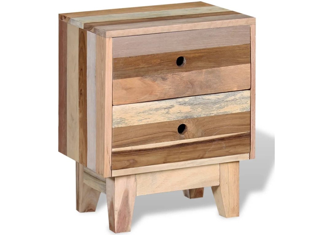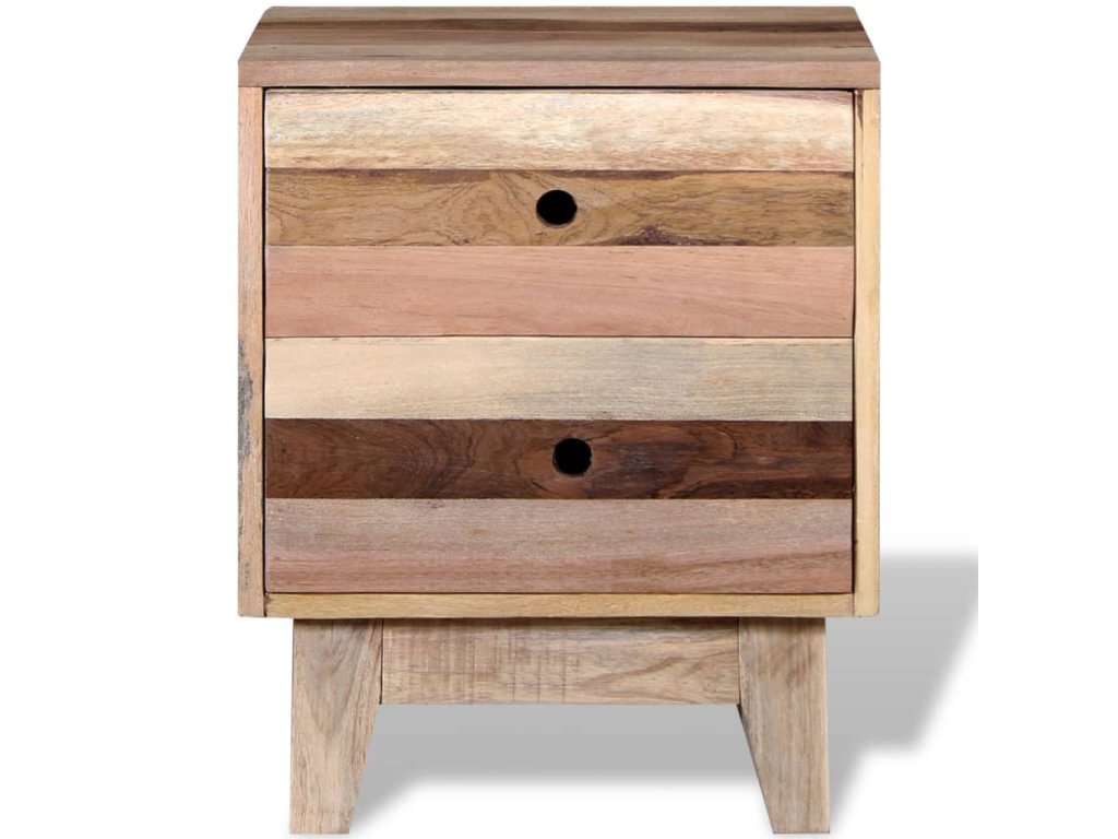Tento noční stolek se 2 zásuvkami je vyroben z masivního recyklovaného dřeva a vyzařuje vintage šarm, takže bude stylovým doplňkem do vašeho interiéru. Odlišnosti ve struktuře a barvě dřeva dávají tomuto kusu nábytku jedinečný charakter.