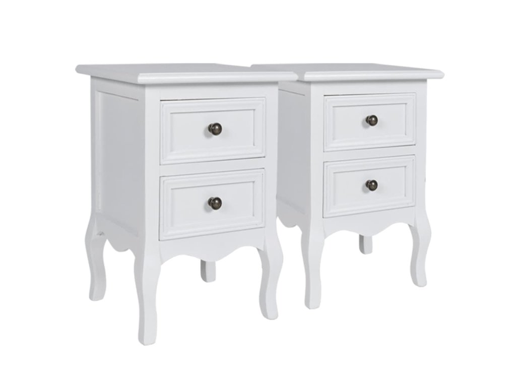 Každý noční stolek má dvě zásuvky, jejichž čelo je vyrobené z pravého jasně lakovaného dřeva. Zásuvky jsou tudíž nejen praktické, ale také spolu se zaoblenými nohami a niklovými úchytkami podtrhují elegantní styl těchto nočních stolků. Skříňky nočních stolků jsou vyrobeny z odolného bílého MDF materiálu.