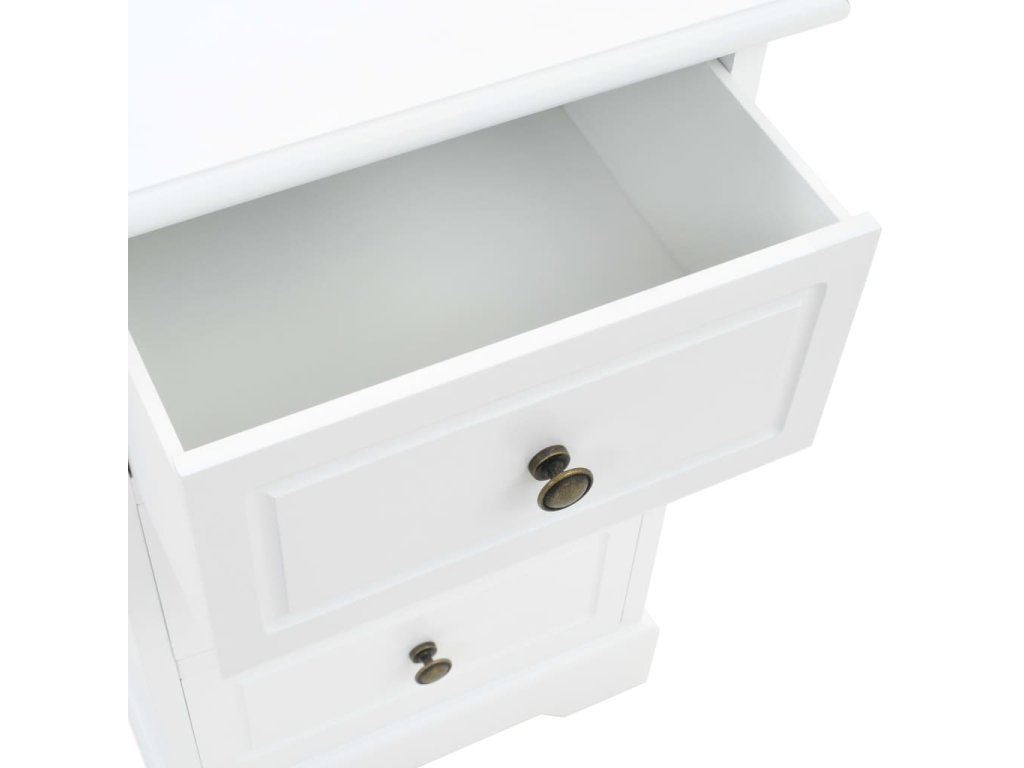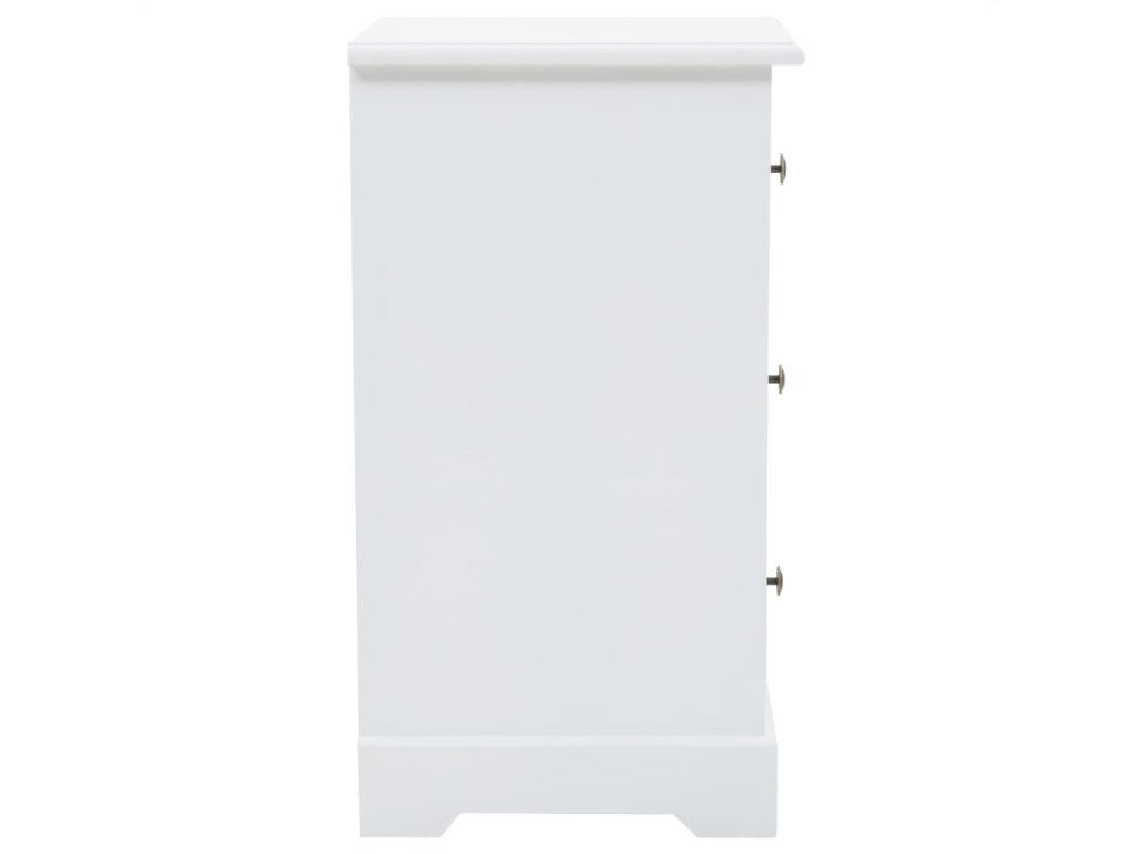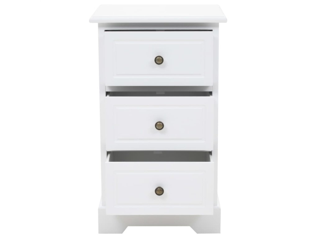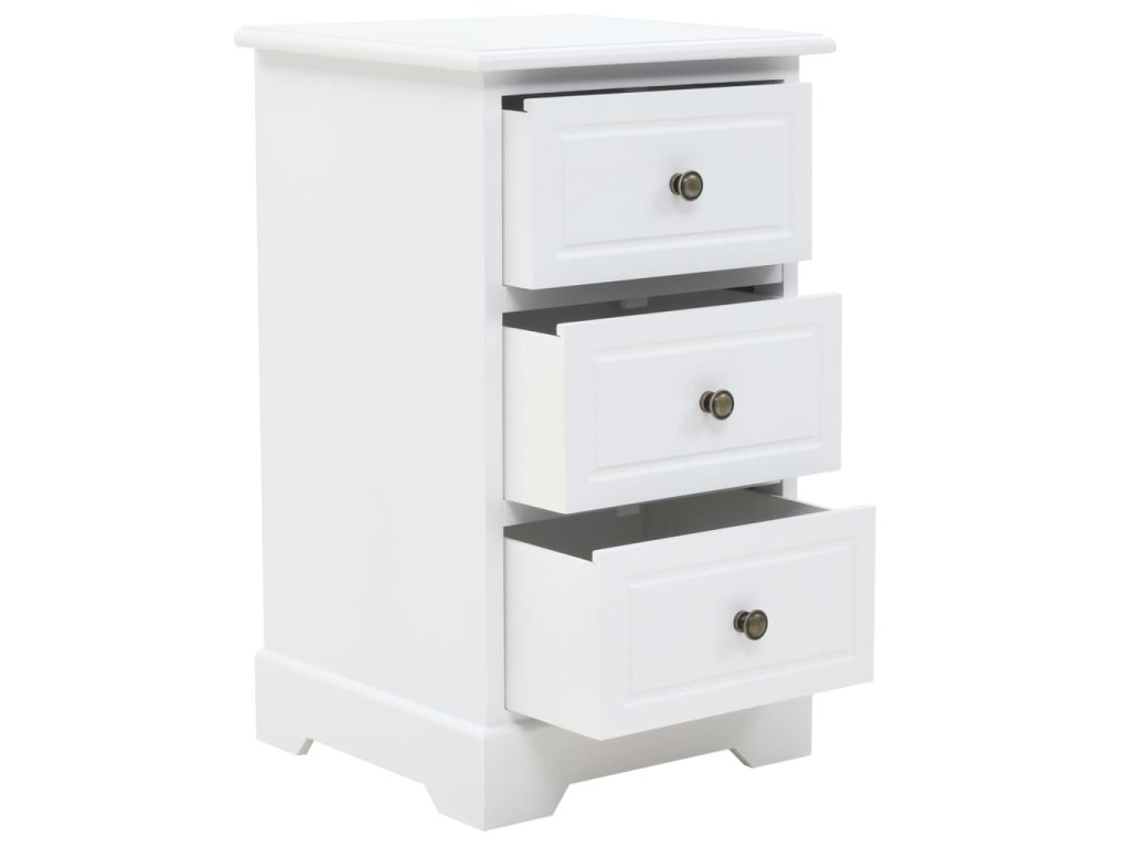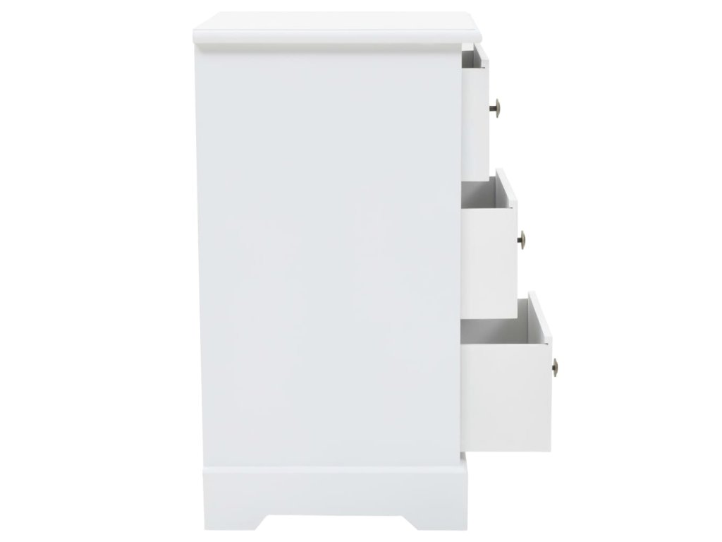 Noční stolek je vyroben z MDF a jeho zásuvky jsou ozdobeny kovovými úchytkami. Disponuje 3 zásuvkami, které vám nabídnou spoustu úložného prostoru, kde můžete přehledně uchovávat menší předměty tak, abyste je měli stále po ruce. Na horní desku skříňky můžete navíc postavit svůj budík, osvěžující sklenici vody anebo dekorativní předměty, jako jsou zarámované fotografie.