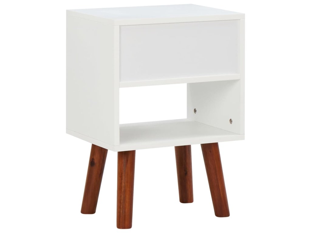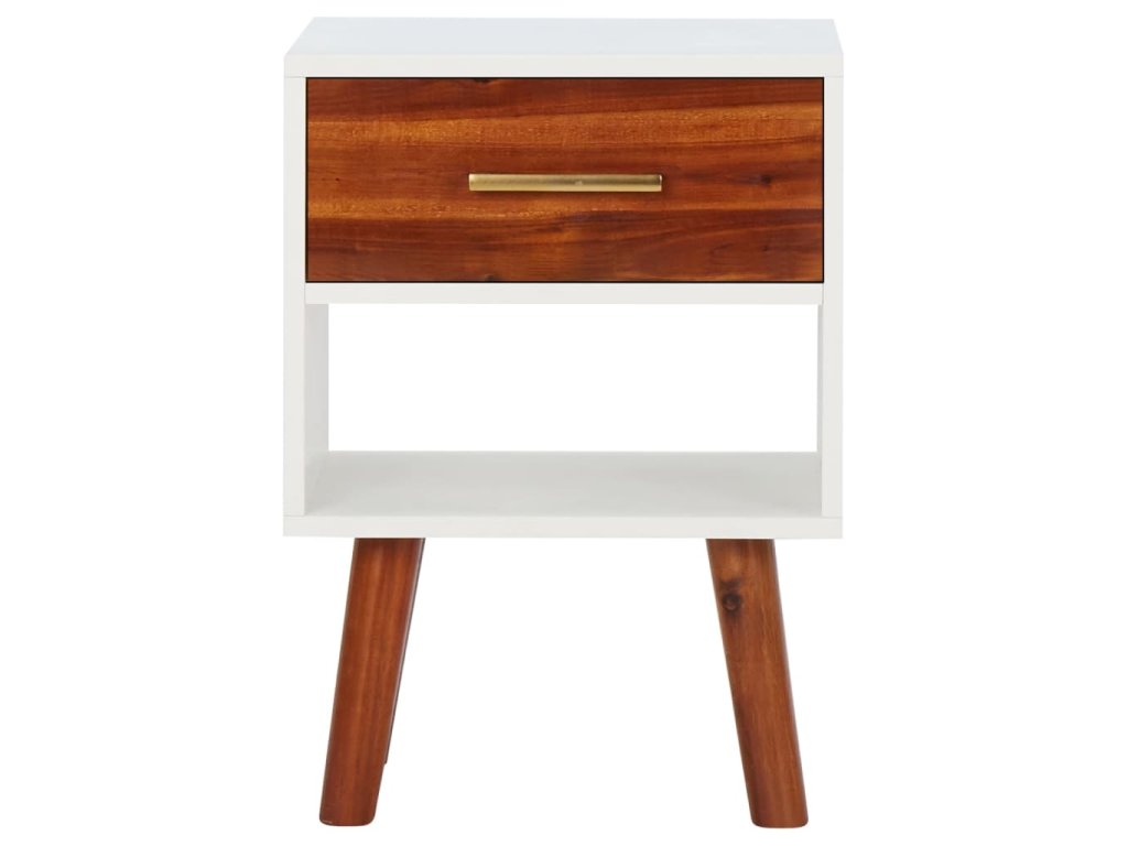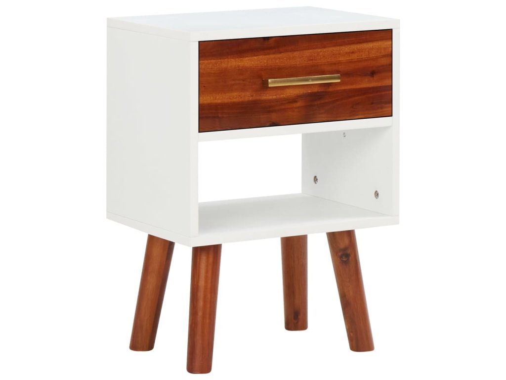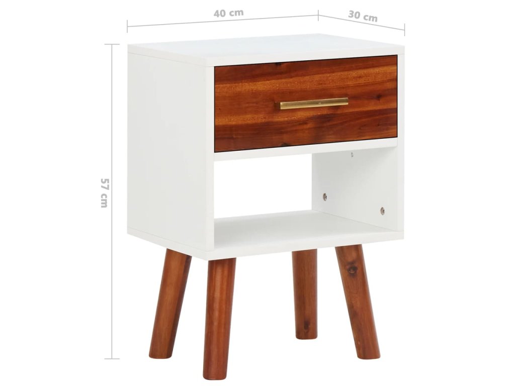 Noční stolky jsou mistrně vyhotoveny z masivního akáciového dřeva a vysoce kvalitní středně husté dřevotřísky, takže jsou velmi stabilní a odolné. Každý stolek má zásuvku a polici, jež nabízí dostatek místa, kde můžete přehledně uchovávat své multimediální zařízení, knihy, časopisy a další drobnosti, které chcete mít po ruce. Zásuvky s úchytkami ve stylu mosazi umocňují celkový retro vzhled obou stolků. Stolky se dají taktéž použít jako odkládací stolky či telefonní stolky. Montáž je snadná.