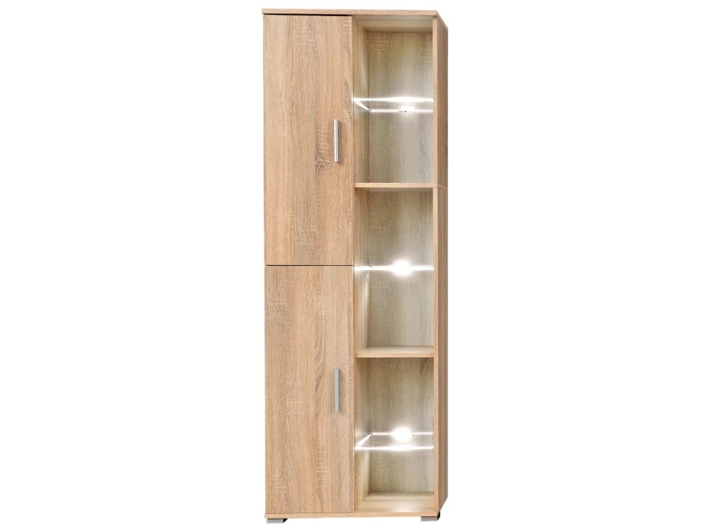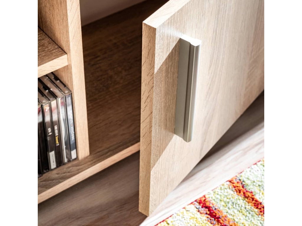 Obývací stěna skládající ze dvou bočních skříněk různých velikostí, TV stolku a nástěnné police poskytuje dostatek prostoru pro ukládání vašich multimediálních zařízení, DVD přehrávače, mediálních nosičů, knih a různých menších předmětů. Je také vhodná pro vystavení dekorativních předmětů, fotorámečků nebo květin. Součástí levé boční vitríny jsou tři skleněné police s energeticky úsporným bílým LED osvětlením, které vytváří příjemnou atmosféru.